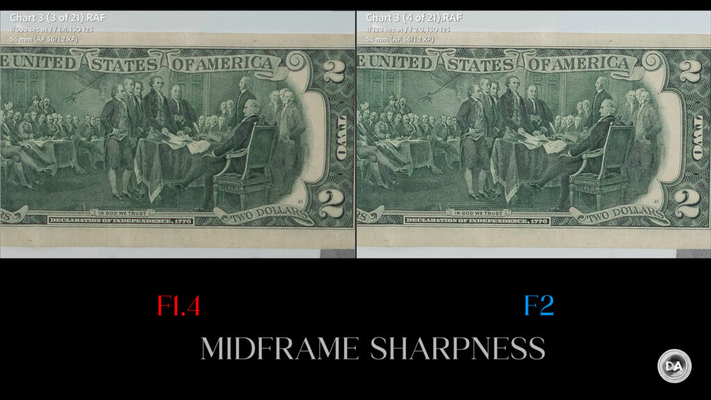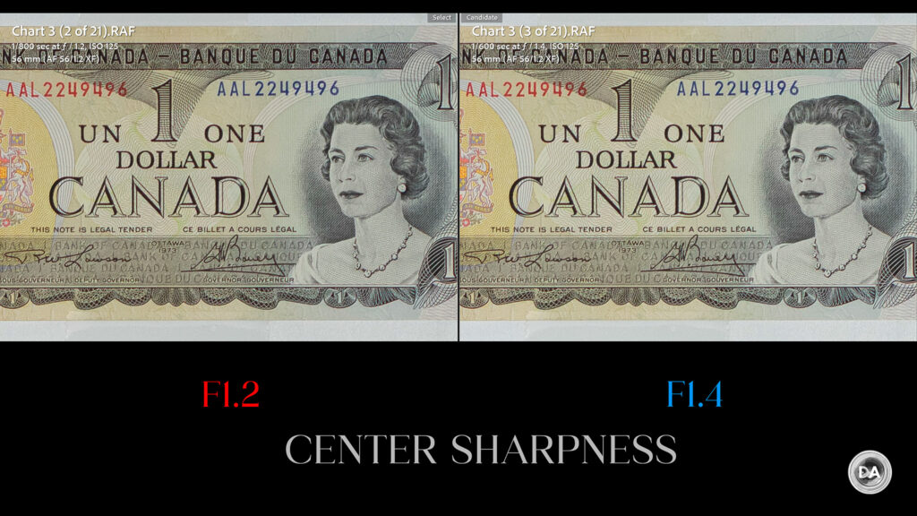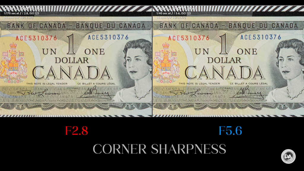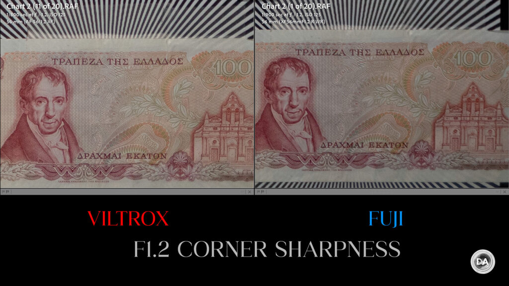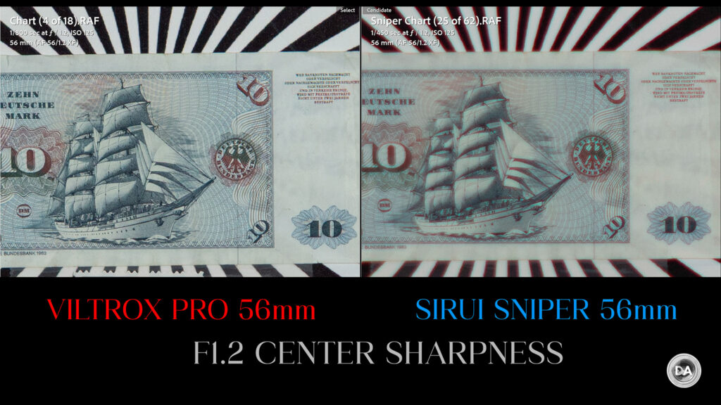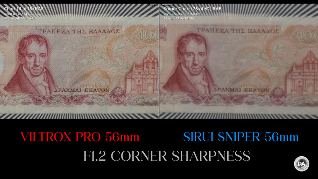 If you want a more vivid demonstration of how much better the Pro 56X is than most of the “cheaper” competition, here’s a look at how it compares to the Sirui Sniper 56mm F1.2 in the center:
