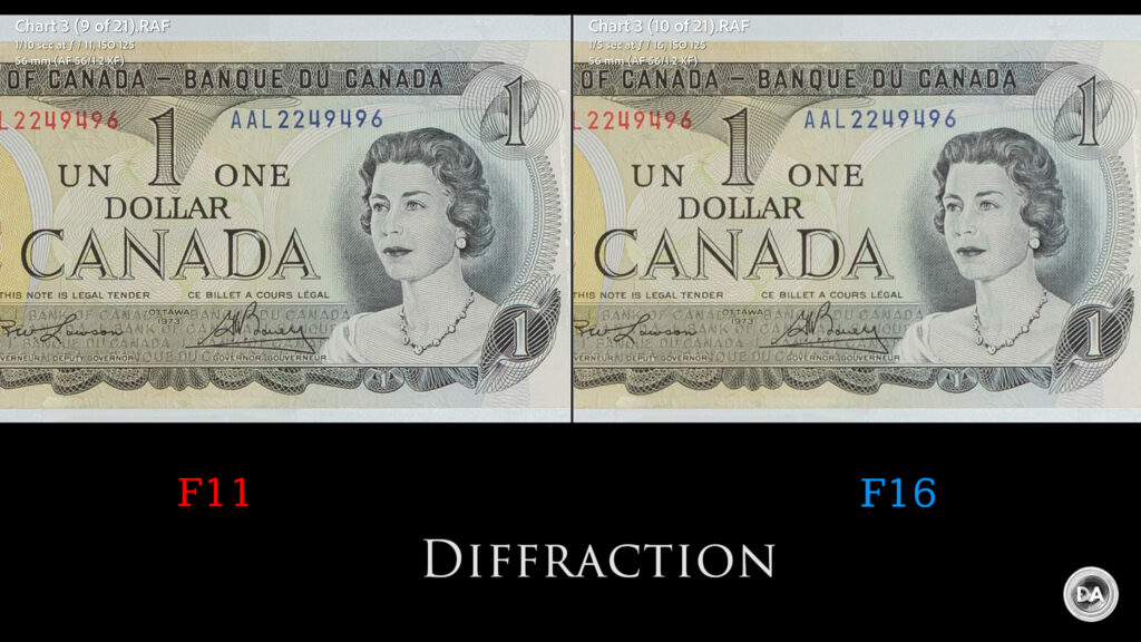 Diffraction will show up by F11, and a bit more by the minimum aperture of F16, resulting in a bit less sharpness and contrast.