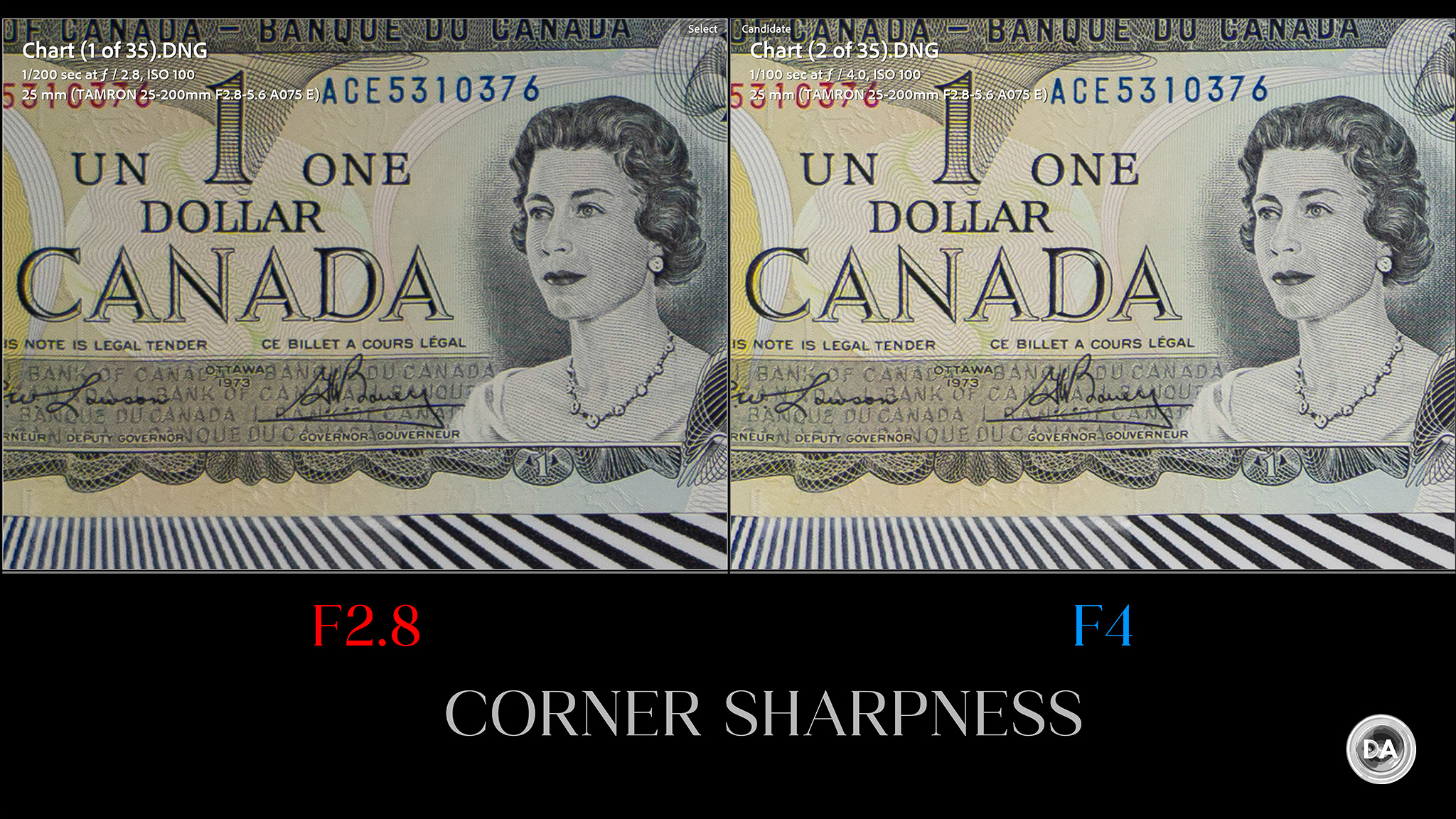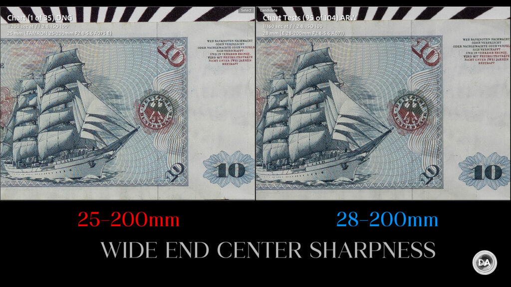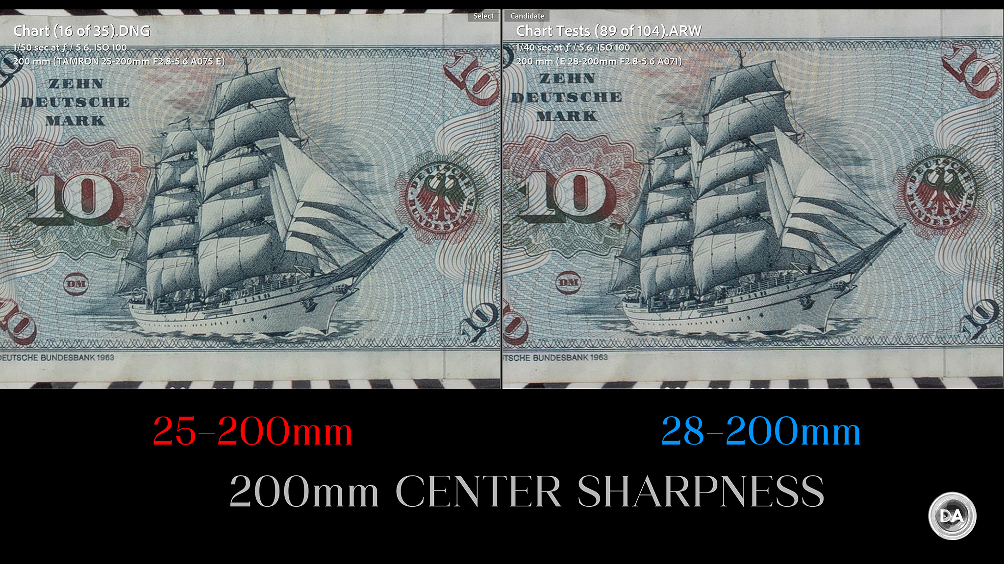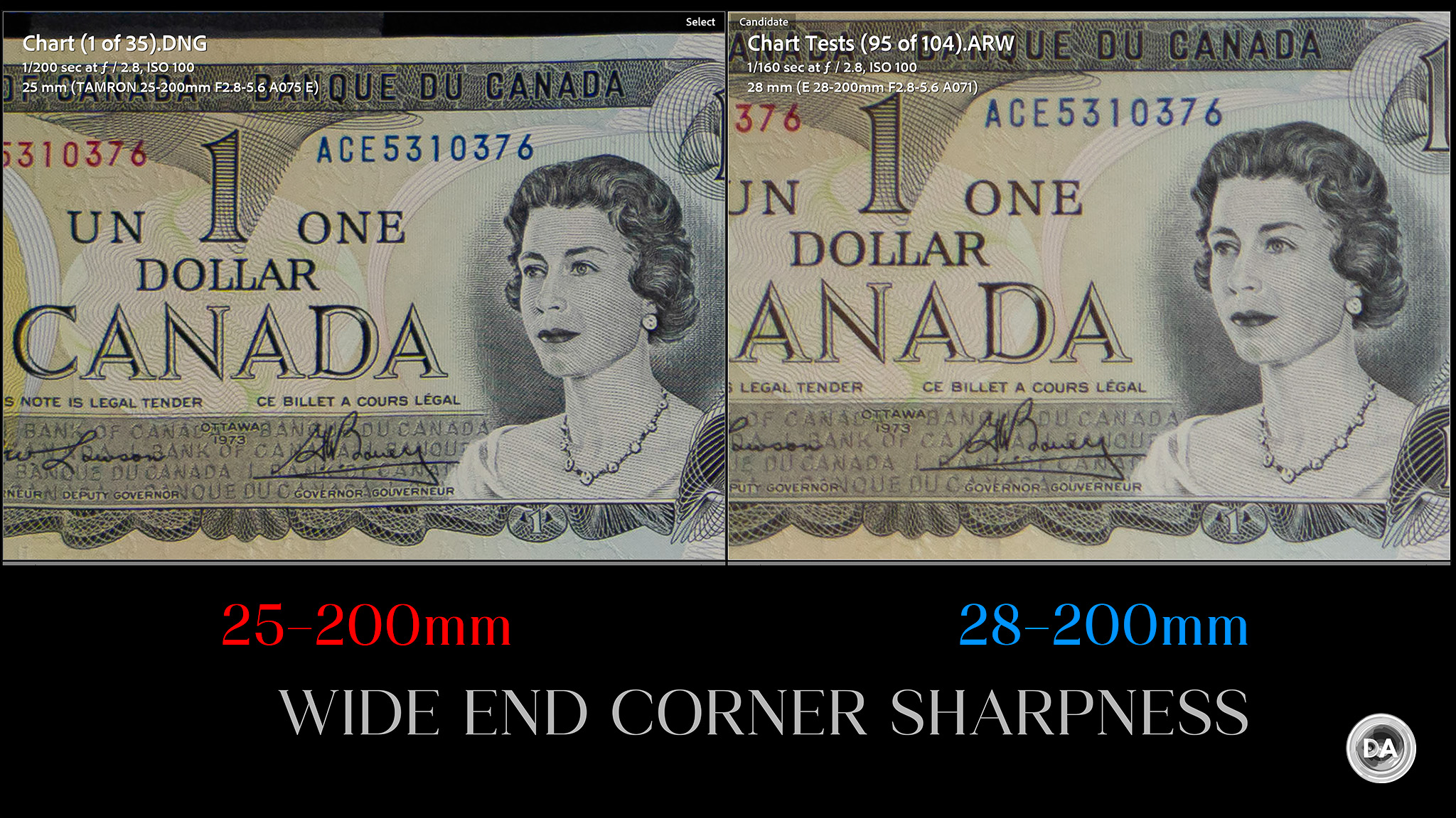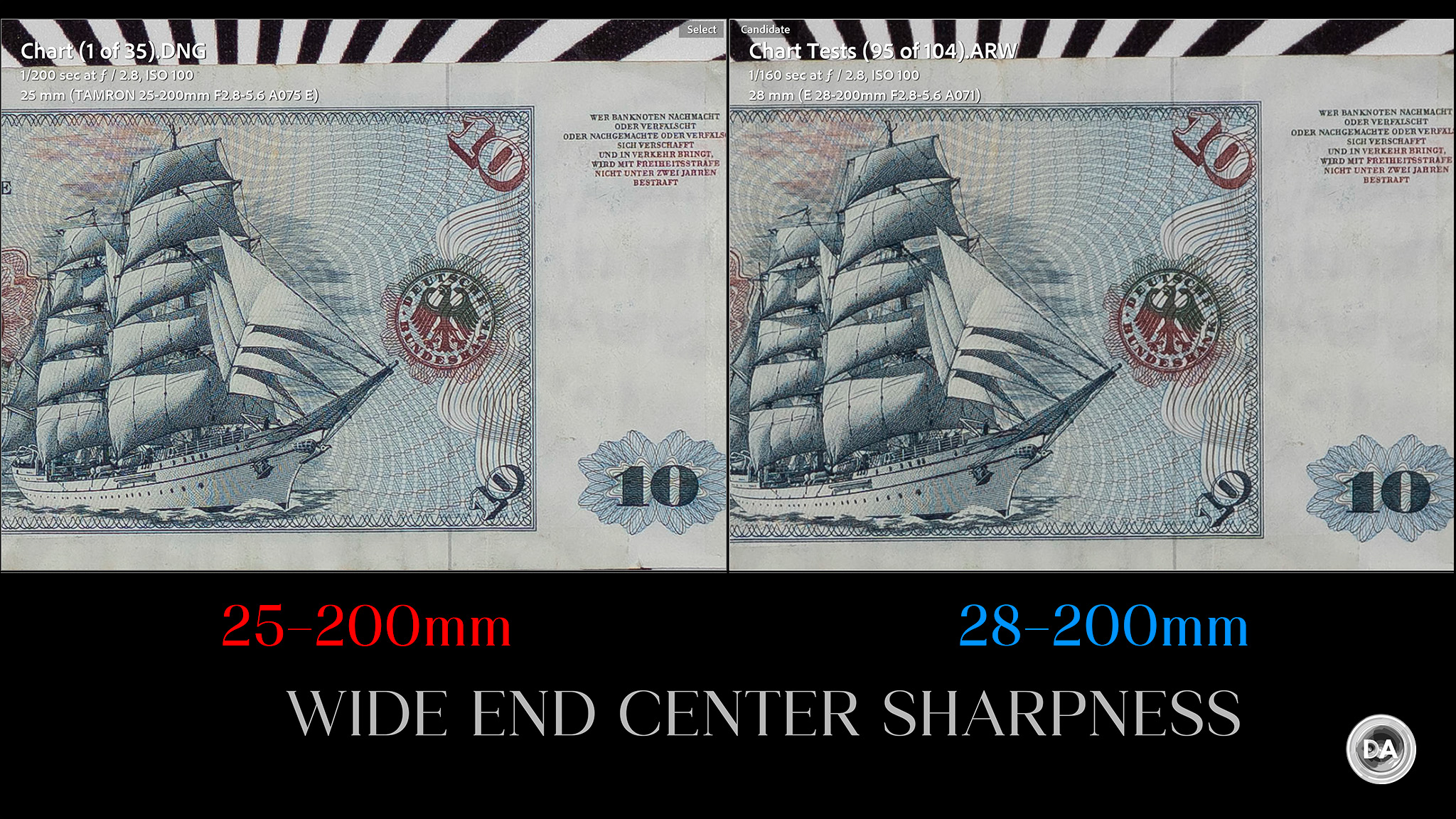 I was also interesting in comparing to the original 28-200mm, which was a lens that always impressed me in terms of sharpness. I found that the newer 25-200mm took the win on the wide end but the two lenses were pretty indistinguishable on the telephoto end.