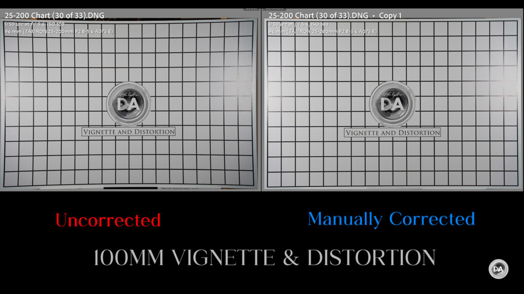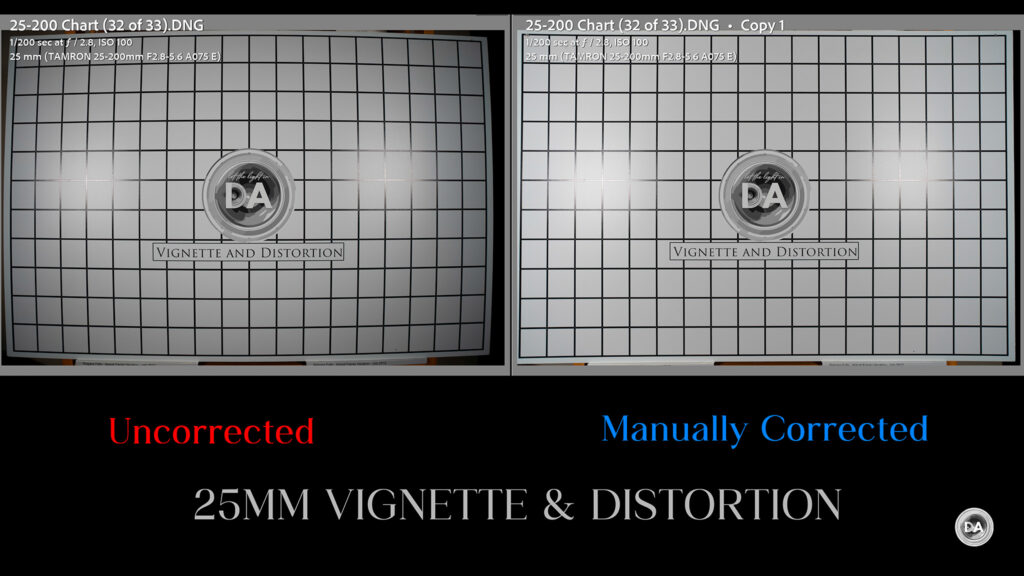 The Tamron has some barrel distortion, too, but to a far less degree. I had to use a +39 to correct the Sigma at 20mm, but the Tamron at 25mm needed a much lower +19, and, what’s more, you can see below that it actually corrects in a nice, linear fashion. Vignette was another story, however, requiring a +96 (nearly maxing out the slider) to correct. The Sigma was even worse, however, requiring me to max out the slider…and still leaving some vignette behind.