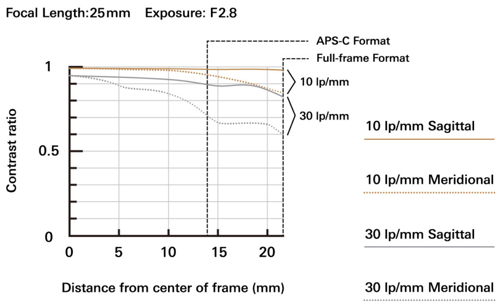 At 25mm, we see a very sharp center and midframe with mild astigmatism, and even the corners still look relatively strong, though the game between the sagittal axis (very strong) and the meridional axis (weaker) grows, indicating stronger astigmatism in the corners. It isn’t difficult to get strong landscape style images at 25mm even when shooting at F2.8.