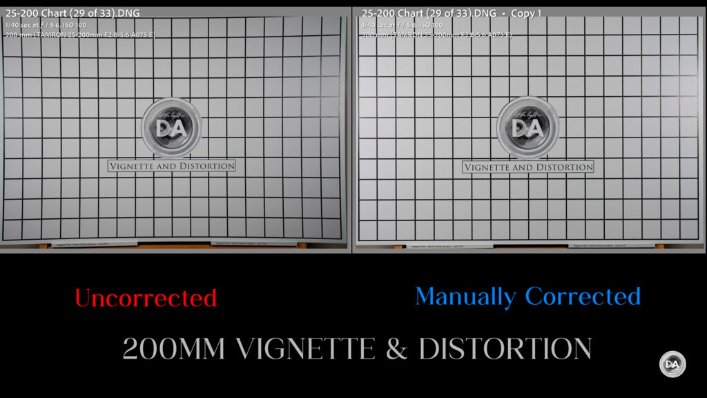 By 200mm the distortion pattern is the same (-7 to correct), as is the vignette. I needed a +45 to correct.