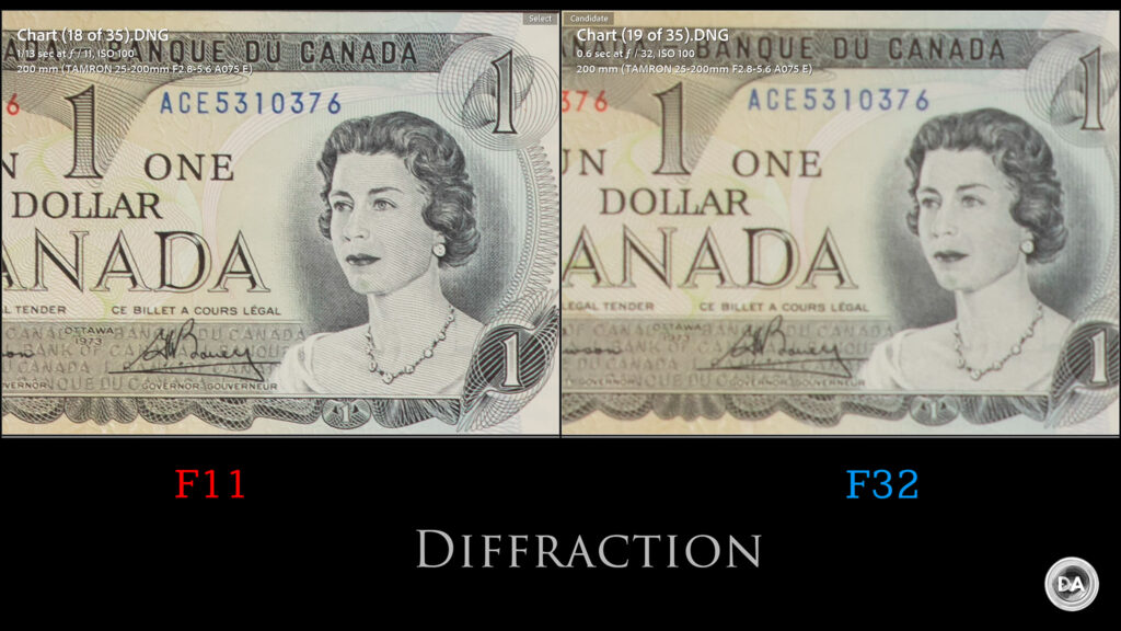Variable aperture zooms like this can have pretty small minimum apertures. At 25mm the minimum aperture is an ordinary F16, but by the telephoto end that becomes F32. Diffraction is going to be a factor at any of those minimum apertures, but even more pronounced on the telephoto end where the minimum aperture is a couple of stops smaller. You can see that while F11 (in the corners, here) looks pretty decent, F32 is simply unusable due to diffraction.
