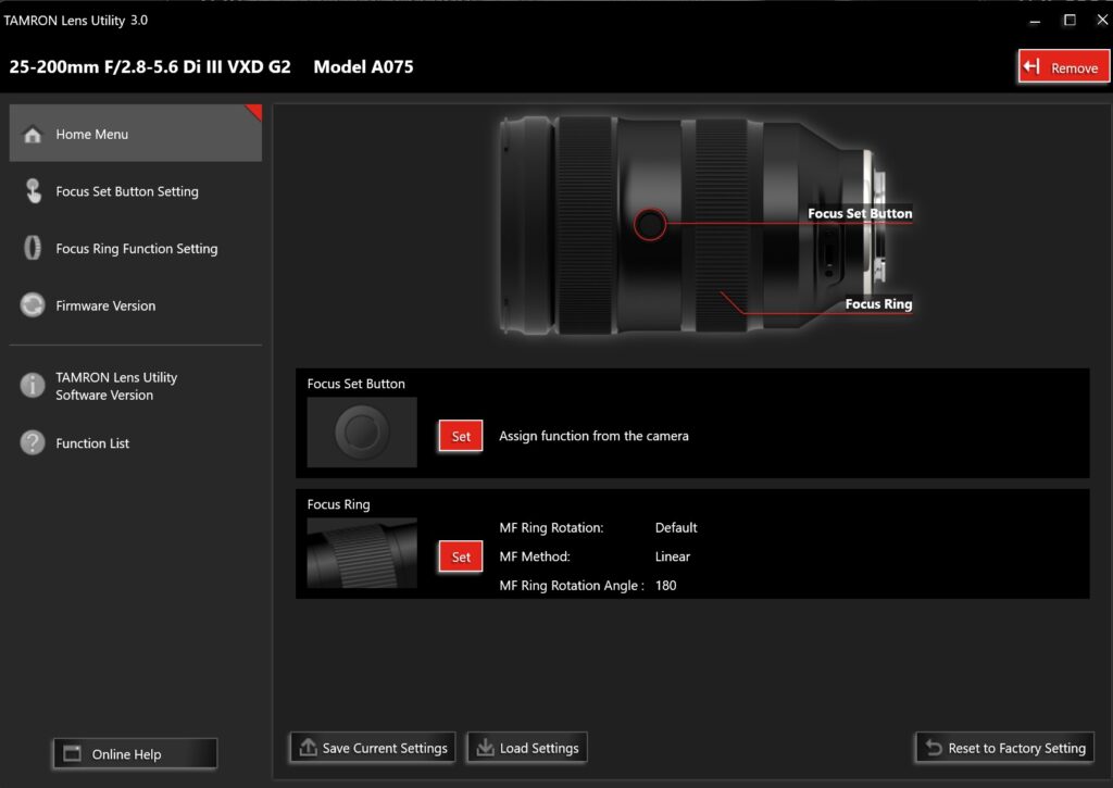 Other functions include tweaking the behavior of the focus ring (linear, non-linear, focus throw distance, ring direction) and the ability to quickly do firmware updates should they come available.
