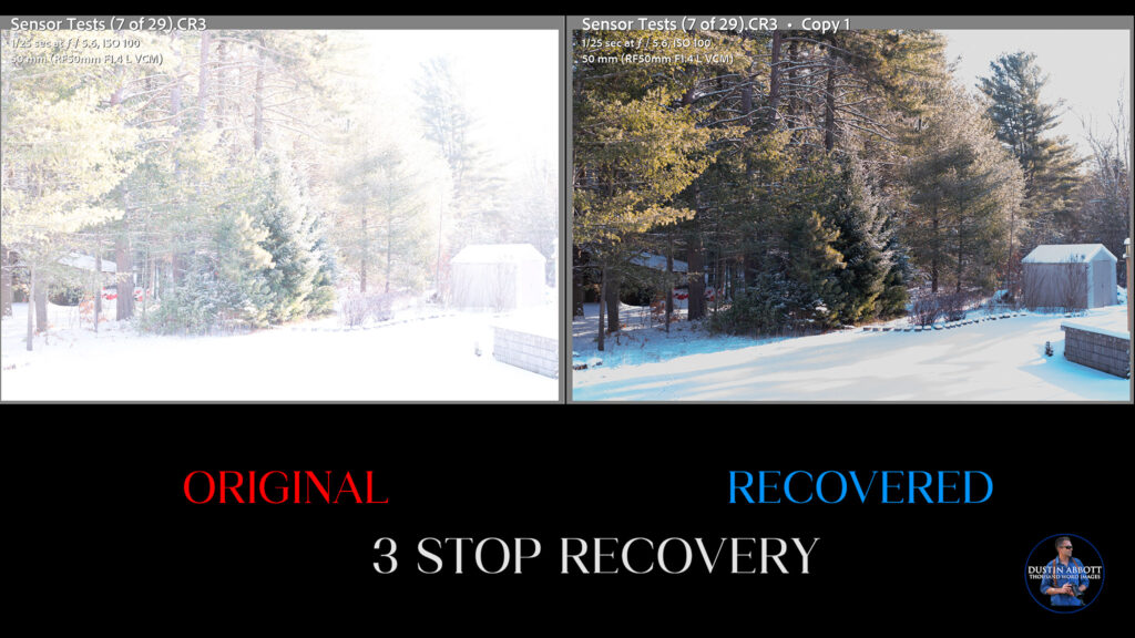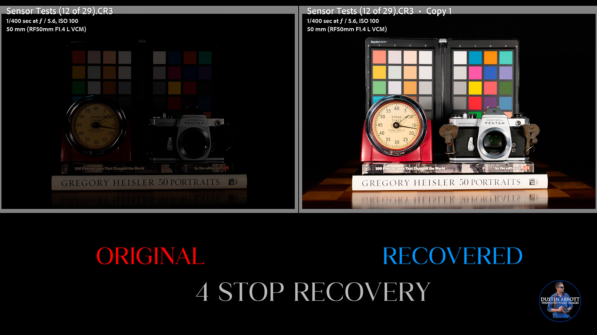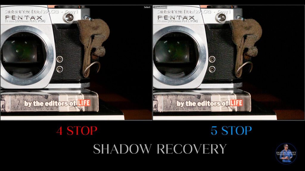 We find the limit between 4 and 5 stops, however, where I start to see the familiar signs of things falling apart. It’s not bad, but I see additional noise in terms of both “grain” and some color blotchiness. You can see how clean the 4-stop recovery on the left is relative to the 5-stop recovery on the right.