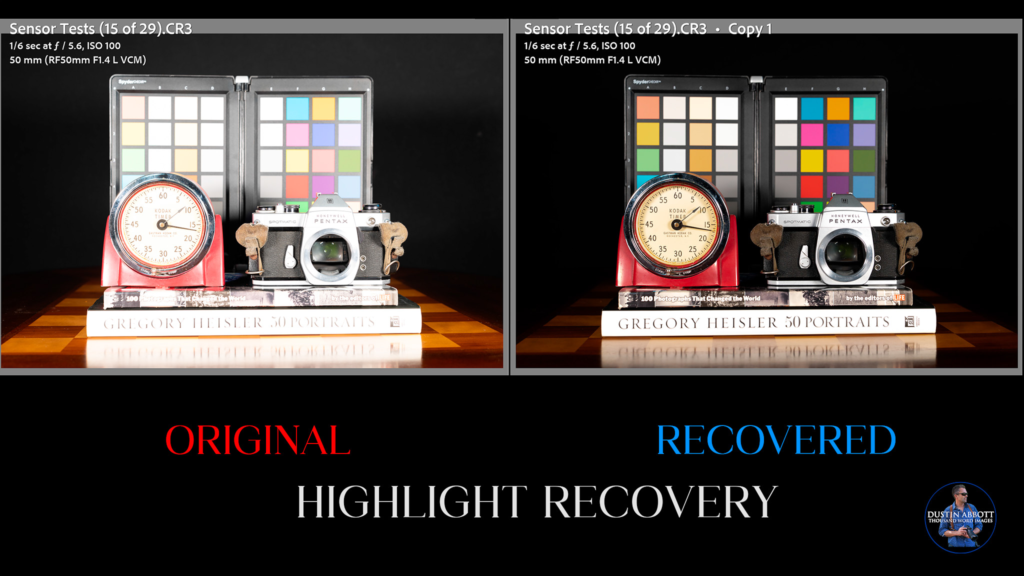 At two stops the recovery (on the right) is near perfect. The color swatches all look correct and I don’t see lost information in the highlights.