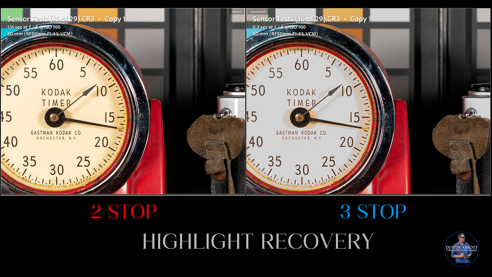At three stops, however, the limits are slightly exceeded. You can see that in comparison to the 2 stop recovery (on the left) that the 3 stop recovery on the right has missing color information on the timer face and some of the color swatches.