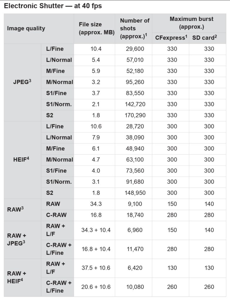 Shooting at the faster 40FPS rate with the electronic shutter means that much more information is having to be recorded, so it is natural that the buffer depth diminishes, but it is still a robust 150 frames even in full RAW. Shooting Compressed RAW increases that figure to 240, and if you are shooting JPEGs, you can get a very healthy 330 frames. Here’s the various options according to Canon.