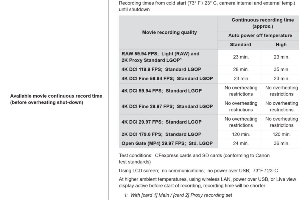 The amount of video modes and options available on the Canon R6 Mark III is impressive. The various options take up several pages to list them all, but here is the section with the most advanced specs.