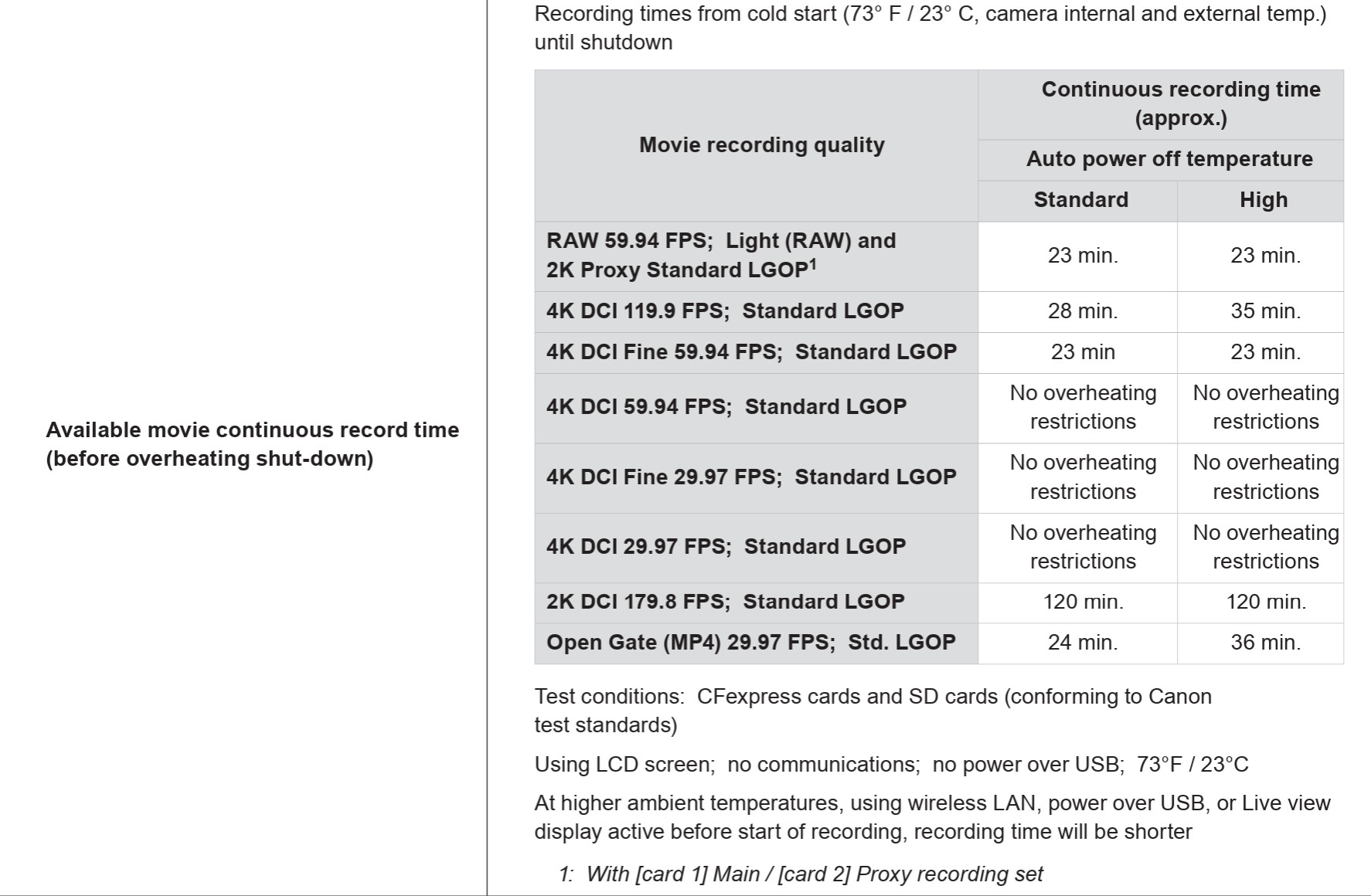 At higher bitrates where more heat is generated, you might see an earlier shutdown due to heat (the camera has no active cooling), though you would have to have a very large storage card to run that long anyway.