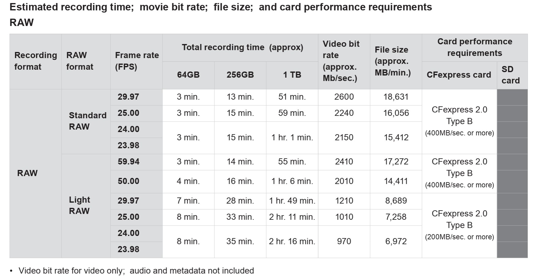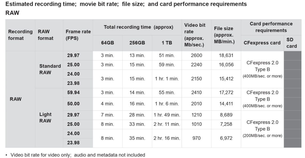 We have thankfully passed the era where video recordings were artificially limited at the 29:59 minute mark, so recording will (in theory) continue until the memory card is filled, which will happen quickly if you film in RAW.