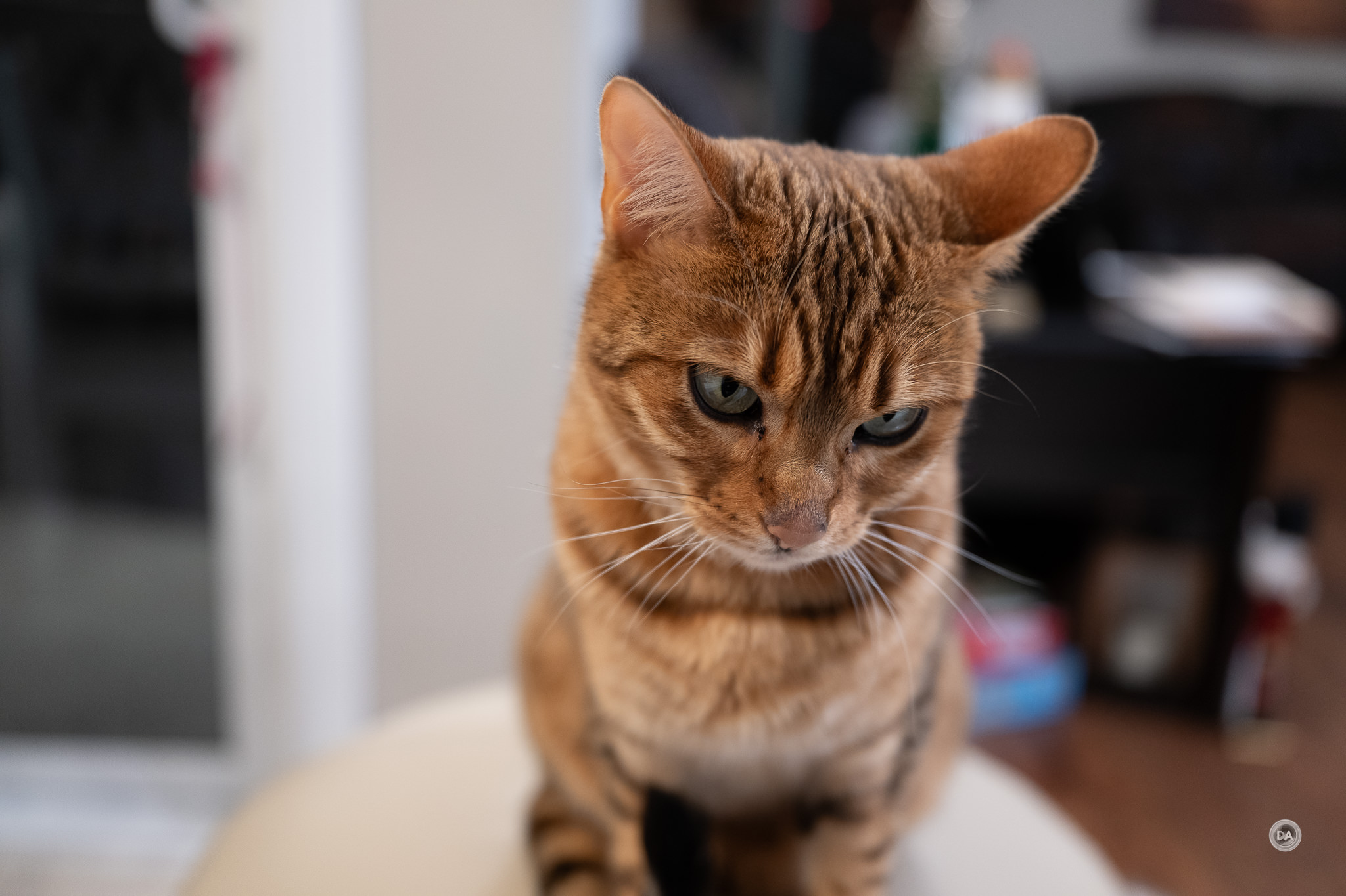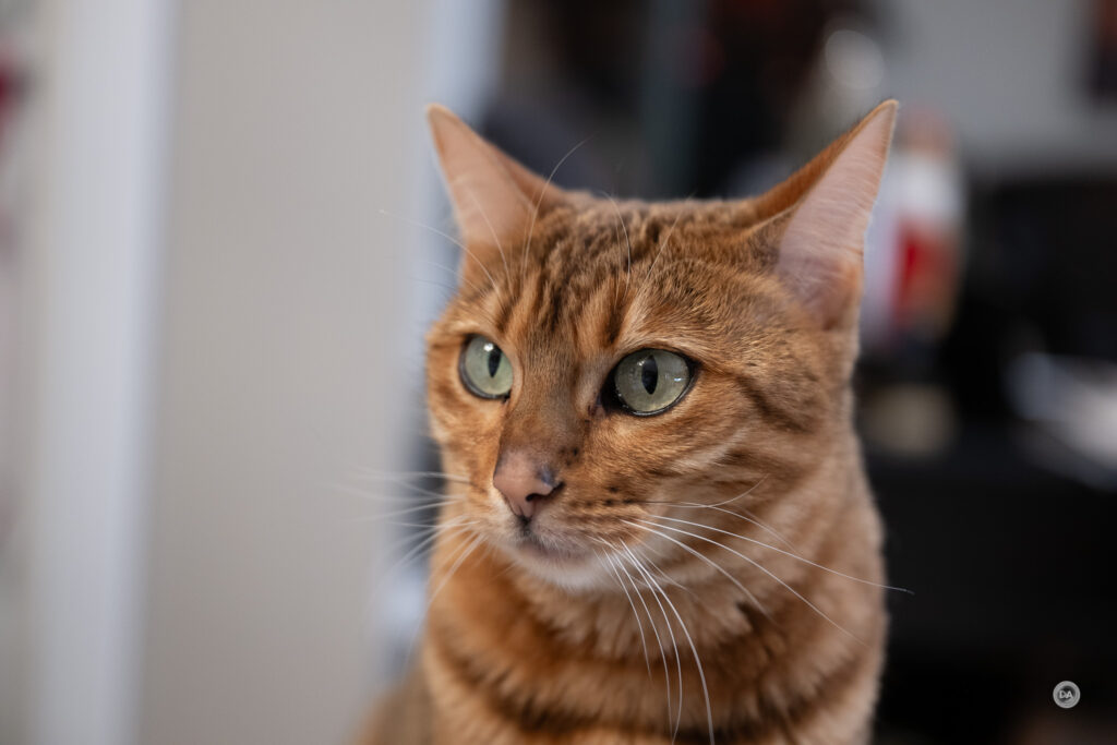 This shot of Nala was taken during a family game night, and there is a lot of clutter in the background, but it is mostly soft.