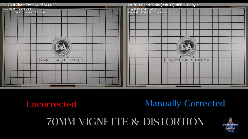 Let’s take a look at vignette and distortion, starting on the 24mm end. Here’s a look at an uncorrected 24mm RAW image (left), and my manual correction on the right.