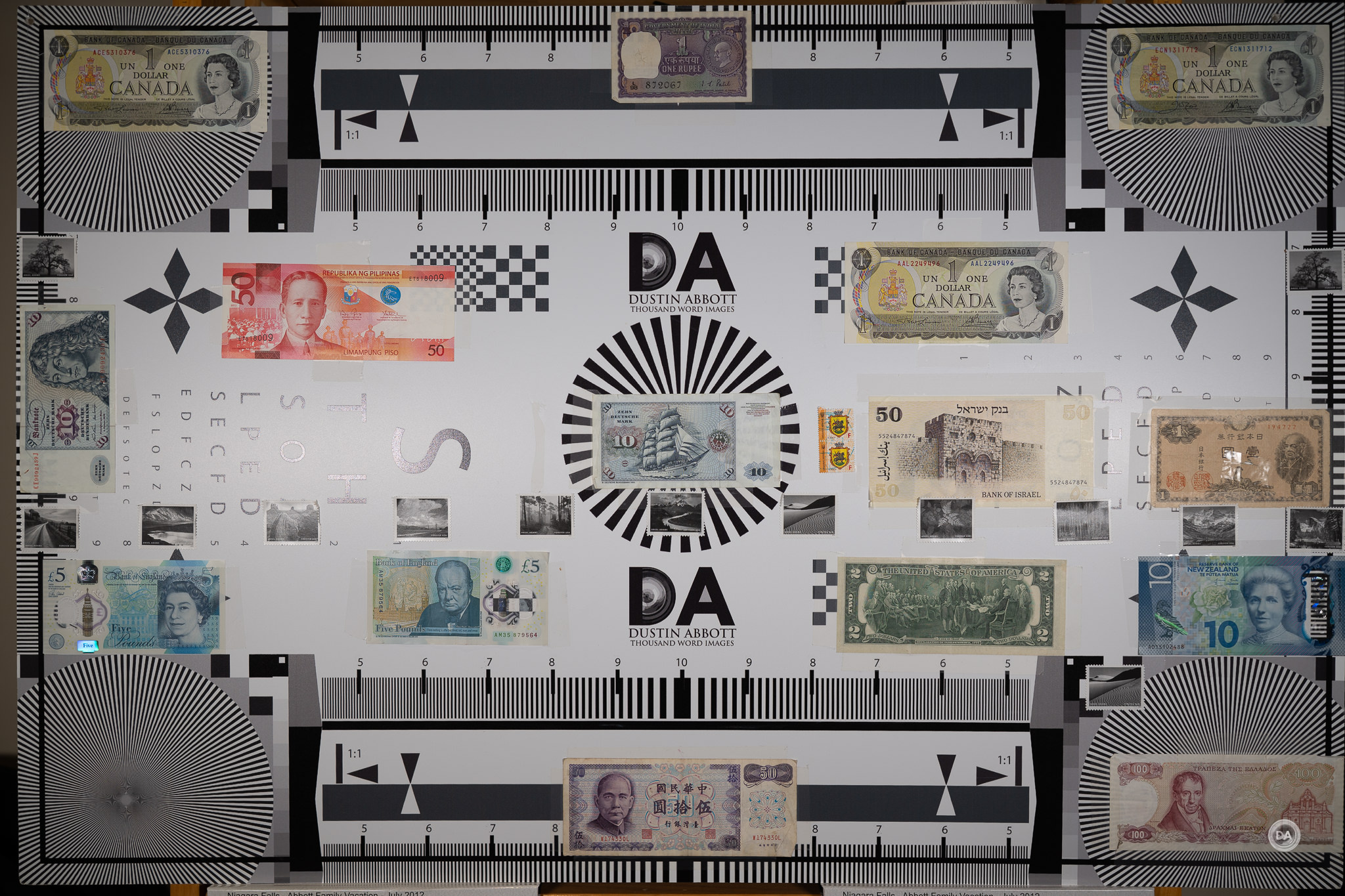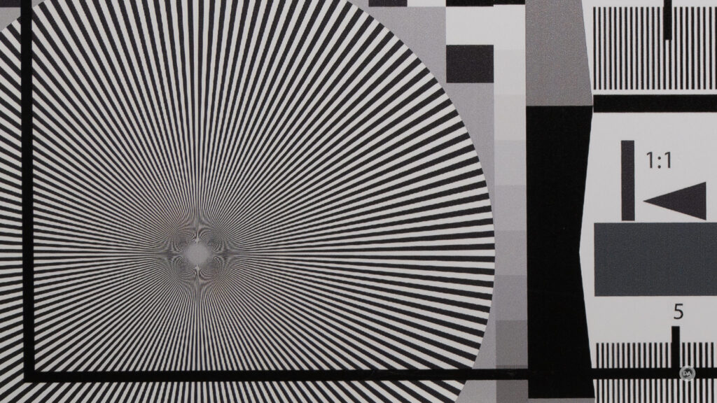 We’ll move on to inspecting our test chart. This test has been done on a 45MP Nikon Z8 sensor. I use a high end tripod and two second camera delay to ensure vibration doesn’t affect images. Here’s a look at the test chart that we will examine at high magnification: