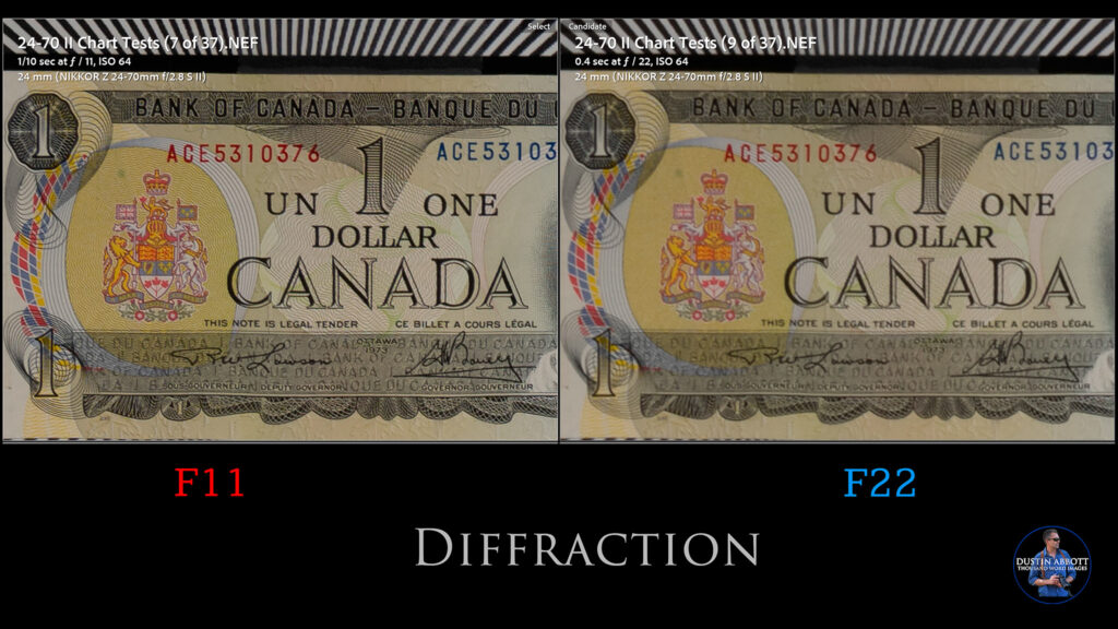 Physics will affect even the mightiest of lenses, however, so while the impact at F11 is minimum, by F22 (which is minimum aperture), you can see a much more obviously softening.