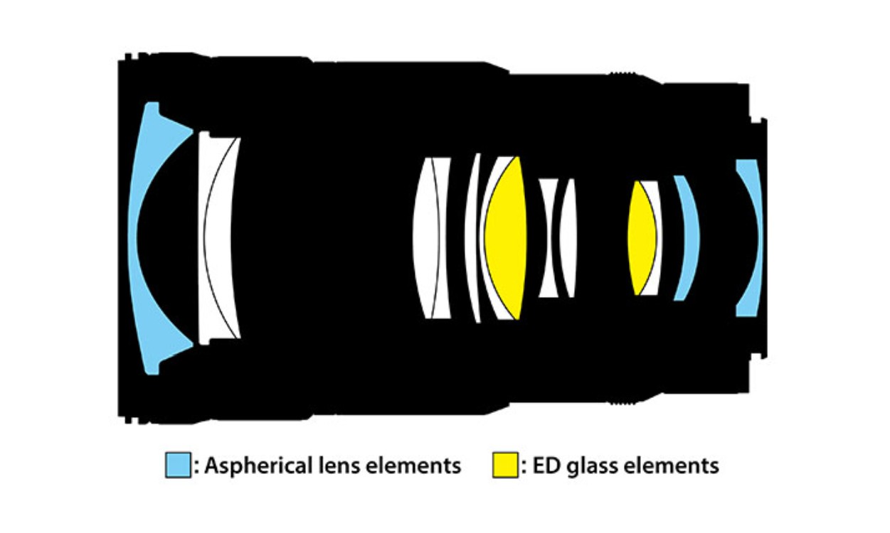 This is a rare case where a second generation lens design actually gets simpler than the lens it replaces. This is an optical design of 14 elements in 10 groups, which includes two ED (Extra-low Dispersion) elements, and three aspherical lenses.