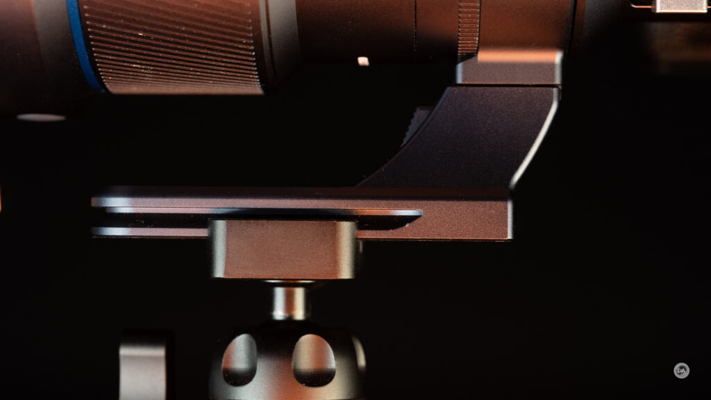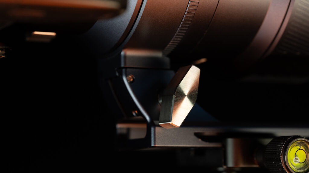 The foot can be easily removed with releasing the tension with a knob on the right side and then depressing a button that allows it to slide off. The foot has Arca-compatible grooves which allow it to mount directly onto many tripods. Another knob (the one with the blue finish) allows you to release the tension on the collar to rotate it. There are detents at the 90° points around the lens.