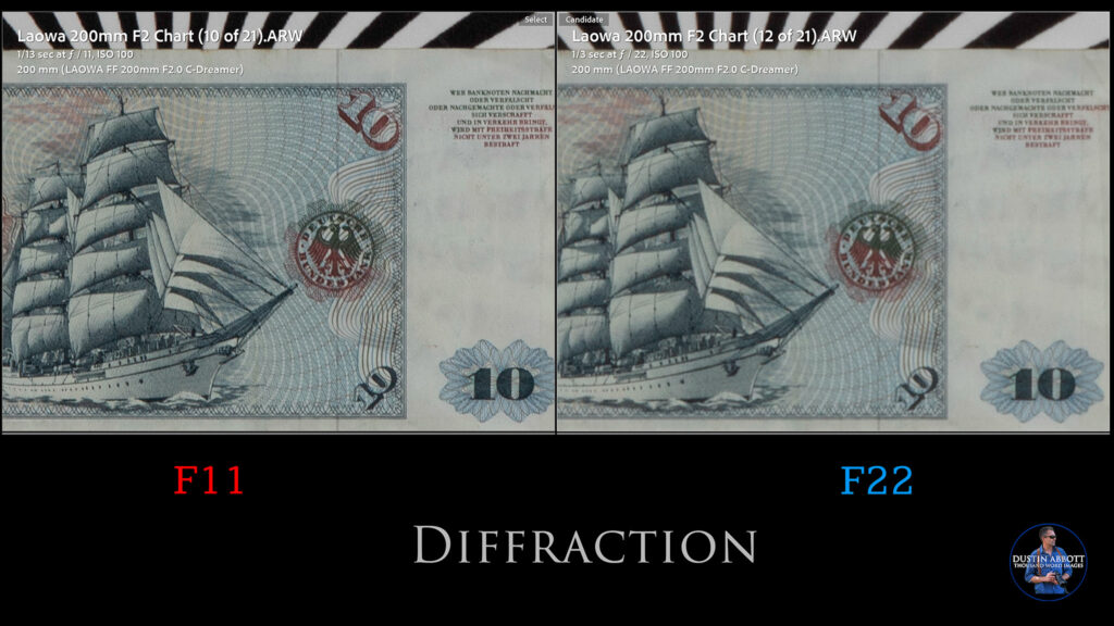 Diffraction is an unfortunate reality on higher resolution cameras, so the image will start softening by F11 with a more obvious softening by the minimum aperture of F22.
