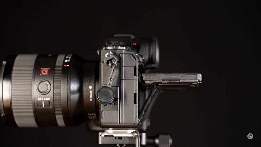 The 3.5mm headphone monitoring jack occupies its own port below that, while below that we have a USB-C port. Charging the camera via the USB-C port requires a PD (Power Delivery) standard at at least 18W and a 3A cable. The USB-C port is the SuperSpeed USB 10 Gbps (USB 3.2) standard for rapid data transfer (you can use this to use the camera as a webcam, do direct live streaming, or connect a smartphone.  The α7V smartly moved to two USB-C ports so that you could charge the camera with one and do data transfer with the other, but unfortunately the α1 II was released before this epiphany. We have a Micro-USB multi port instead.