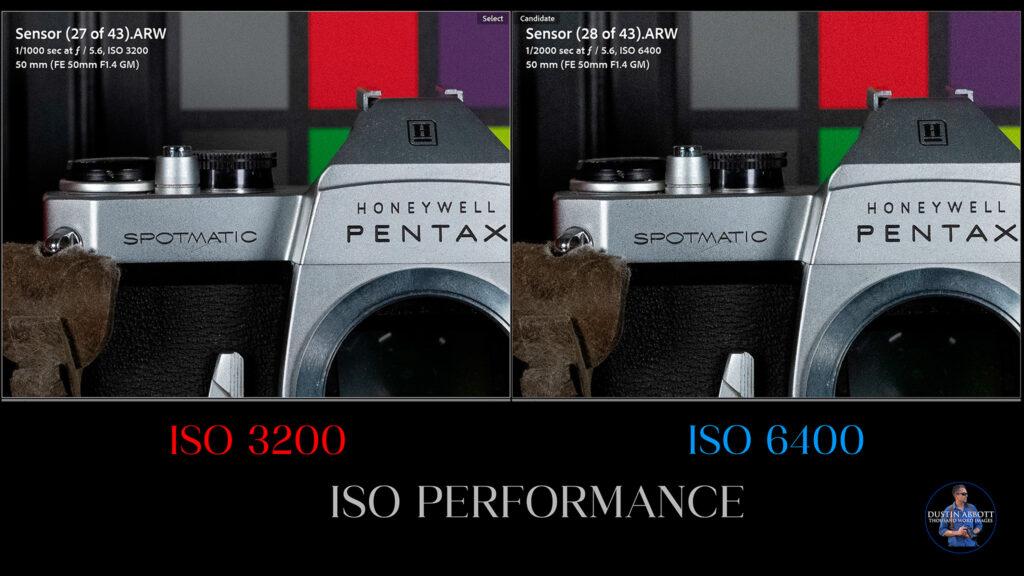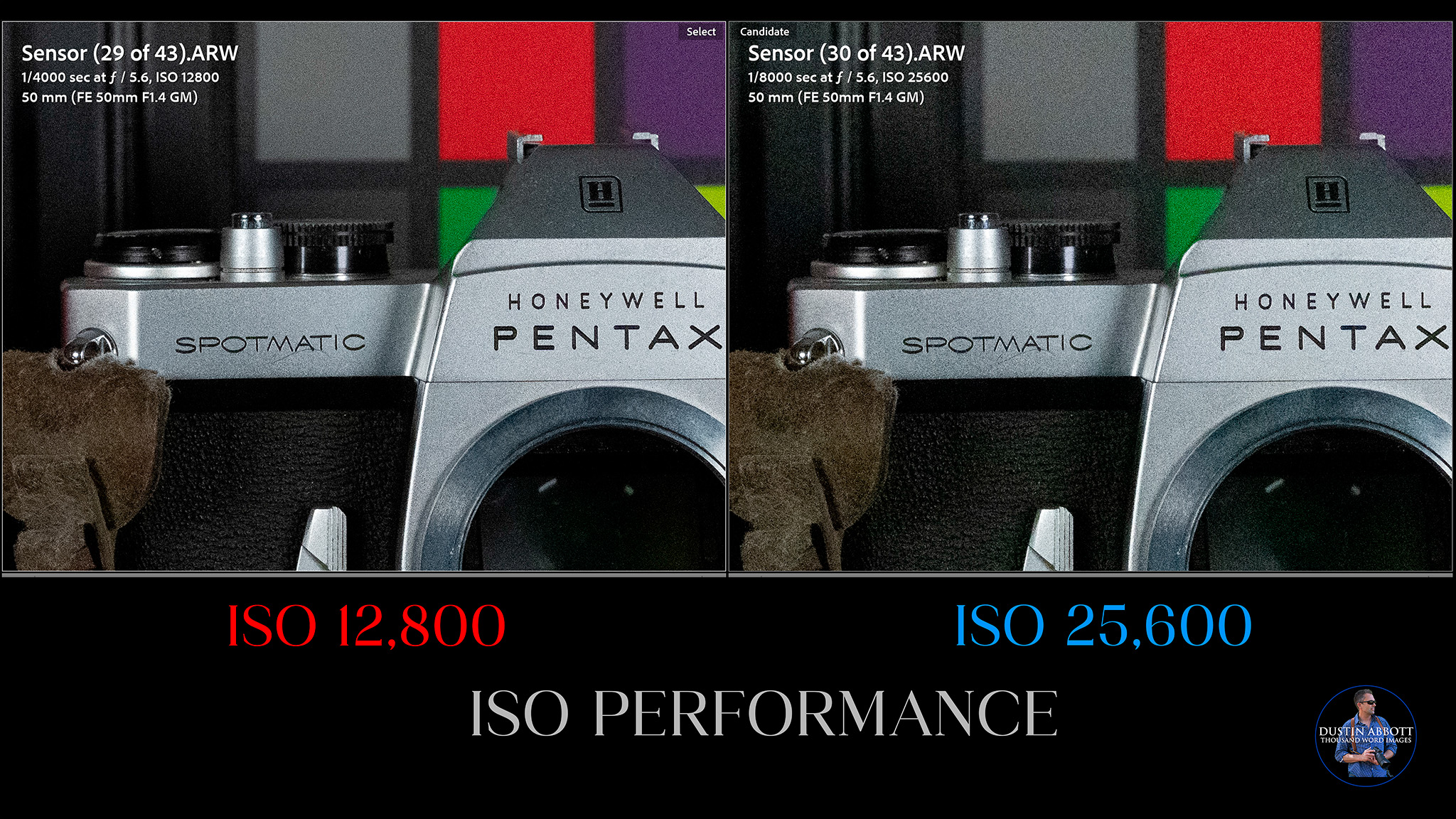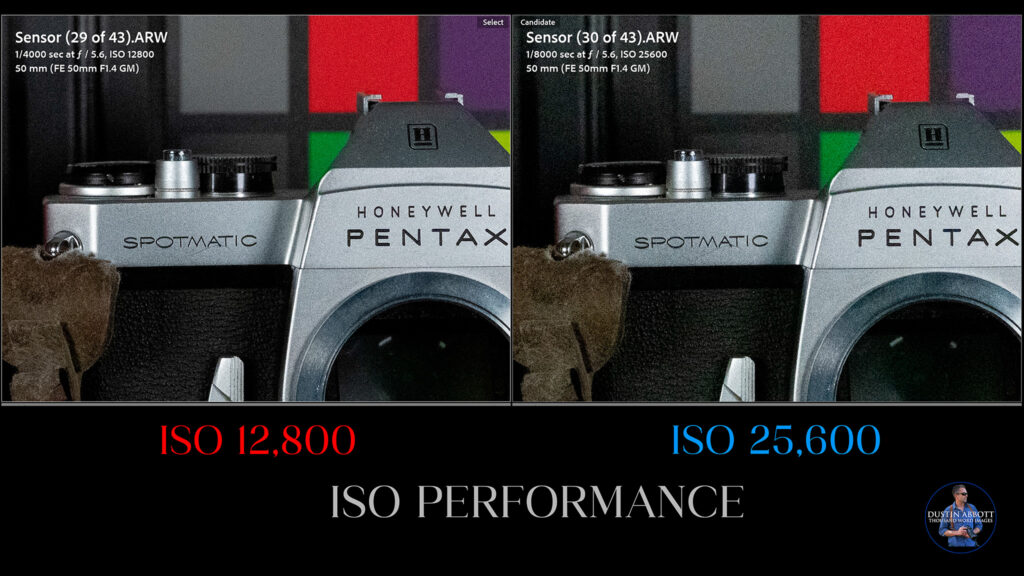 Things are mostly similar at ISO 12,800, with black levels still quite inky.  By ISO 25,600, you can start to see some uneven pixels in the black area along with a bit of green color shift. I would avoid the values beyond this point.