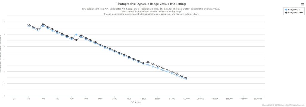 While the basic sensor is the same in the α1 II as it was in the previous generation α1, Sony always manages to get a bit more out of the second generation use of a sensor. It’s been true in multiple generations of the a7R series and even a7 series as well. Photons to Photos shows a slight but consistent improvement in the dynamic range according to their tests. (Black represents the α1 II).