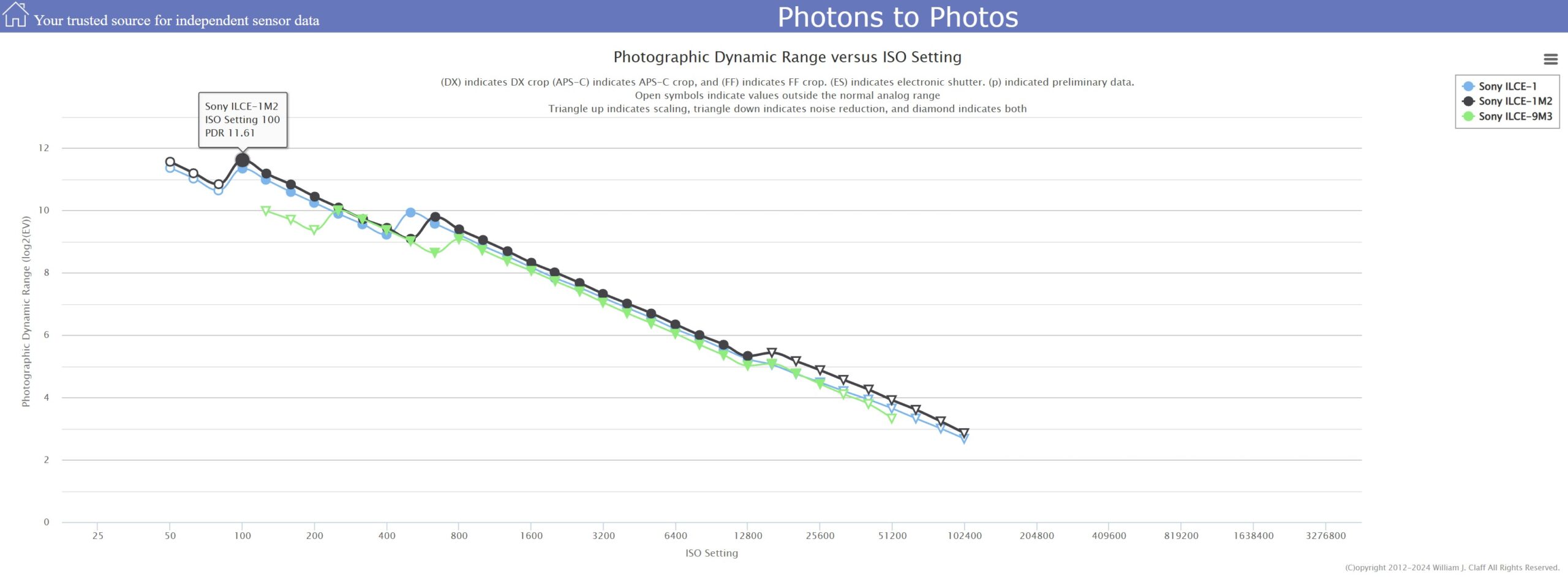 And, while the α9 III is unquestionably Sony’s leader in terms of pure speed, it’s 24MP sensor isn’t anywhere near as effective at either resolution or dynamic range. You can see from the green line that it falls significantly behind either α1 camera.