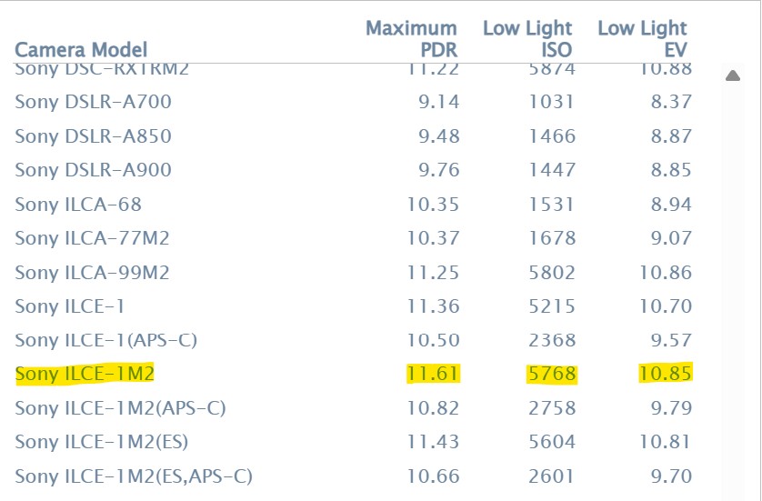 Photons to Photos has their own process for measuring dynamic range, so their findings never match what companies market, but because they have a consistent criteria, it does give a consistent metric for comparing one camera to another. They rate the dynamic range (for photos) at 11.61 stops, which bests the α1’s 11.36 stops by a meaningful margin. The Canon R5 MKII is rated at 11.45 stops, while the Nikon Z8 measures at 11.32, positioning Sony in a really solid position over the competition. Sony’s own α7RV takes a very slight win for the high resolution DR crown at 11.70 stops, but that’s probably too little a difference to be observable. The bottom line is that this is a very, very good sensor for dynamic range performance.