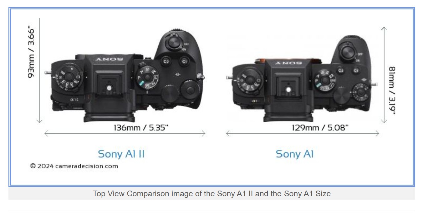The α1 looks tiny by comparison, and the α1 II isn’t much different. It measures at 136.1 (w) x 96.9 (h) x 82.9 mm (d), or 5.4 x 3.8 x 3.3″. That isn’t much different than, say, the recently released α7V (my review here). It is considerably wider and a bit deeper than the original α1, however, and that makes a significant difference. That difference can be primarily seen from the top view, which shows a wider camera camera with a much more robust grip on it. *Image courtesy of Camera Decision.