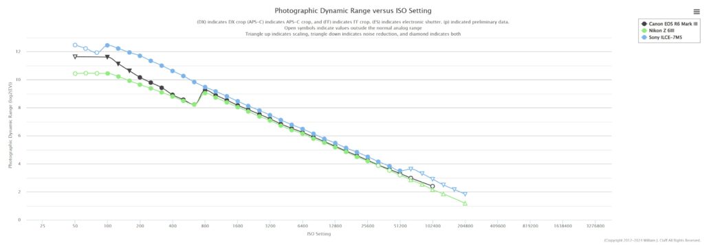 In their tests, the dynamic range reaches a full 12.5 stops, which is three quarters of a stop better than the a7IV. That’s two stops(!!) better than the Z6 MKIII and almost a stop better than the Canon R6 MKIII. In fact, it is basically on par with the medium format Fujifilm GFX-100 II. Wow! Impressive.