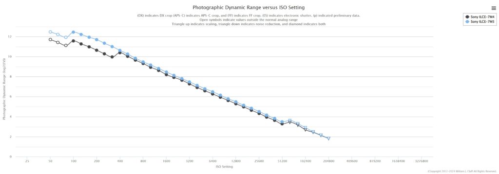 Moving to a stacked sensor has the potential to negatively affect dynamic range, but Sony has always been very good in this metric. In fact, it appears that they have outdone themselves. I often refer to Photons to Photos for their empirical testing of this metric, and, according to them, Sony has created the best dynamic range we’ve seen in a full frame (35mm) camera in the a7V’s sensor. You can clearly see an improvement over the a7IV.