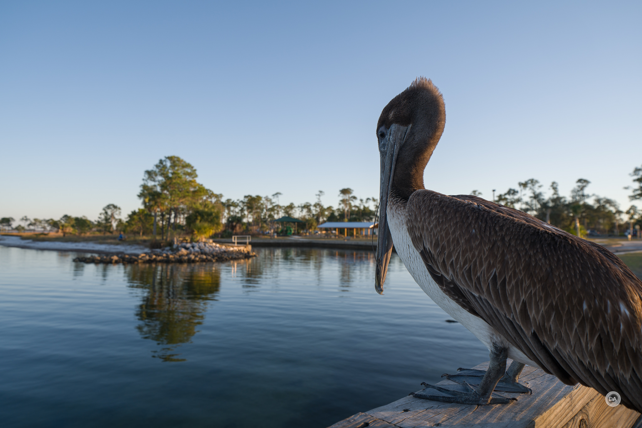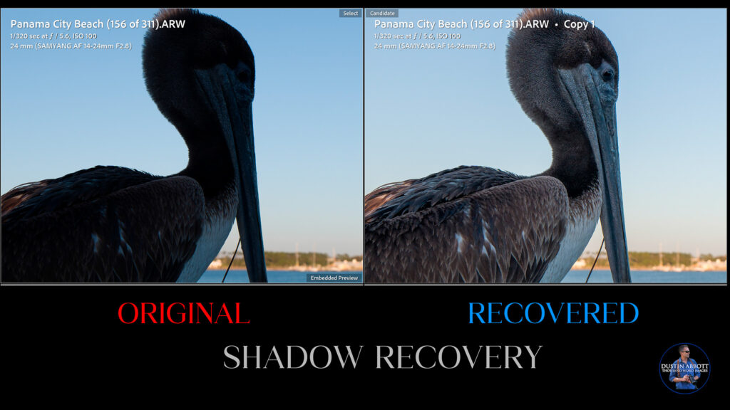 How does that play out practically? Here’s a shot of a pelican, and you can see that the strong shadow recovery allowed me to regain the detail lost in the shadows before recovery.