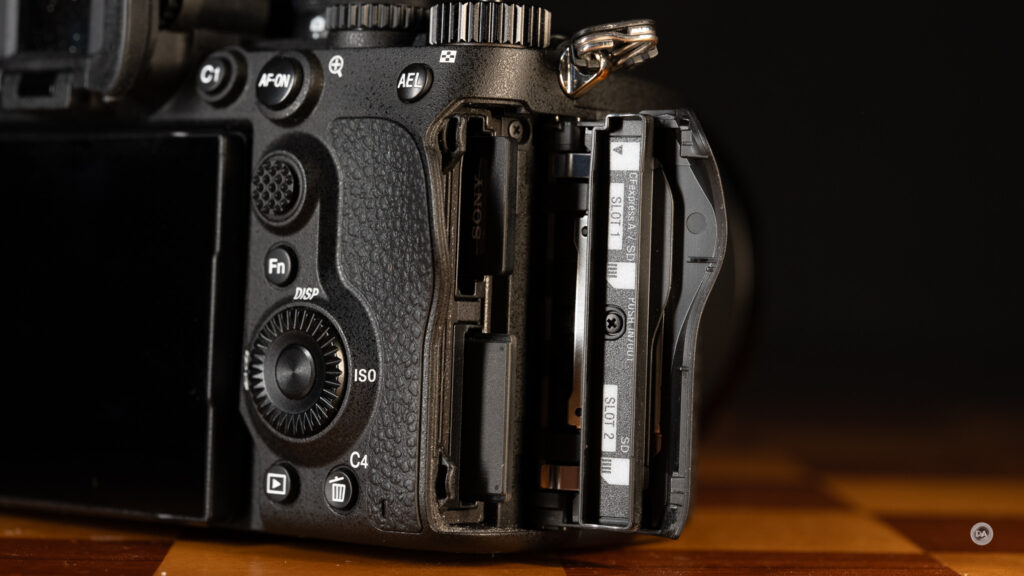 On the right side of the camera we have dual card slots. One is a combo CFExpress Type A/UHS-II SD slot which allow you to use either/or, while the second slot is a UHS-II SD card slot. This gives you a number of recording options. I tend to use the “Sort” option that writes RAW images to one card and JPEGs to the other. The upgrade to CFExpress here allows for much faster data transfer (almost 3x as fast), and the price of CFExpress Type A cards has really dropped in recent years due to more and more companies producing them.