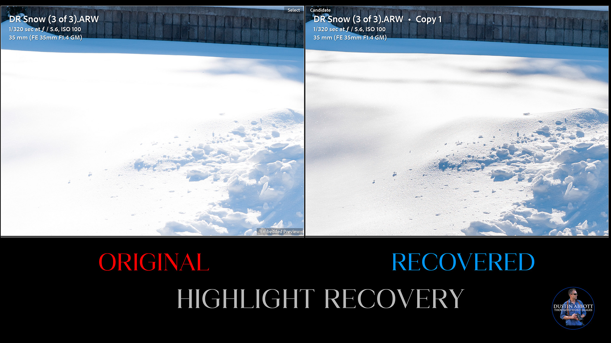 Or, the highlight recovery can allow me to recover lost detail and contrast from bright snowy areas of an image, like this: