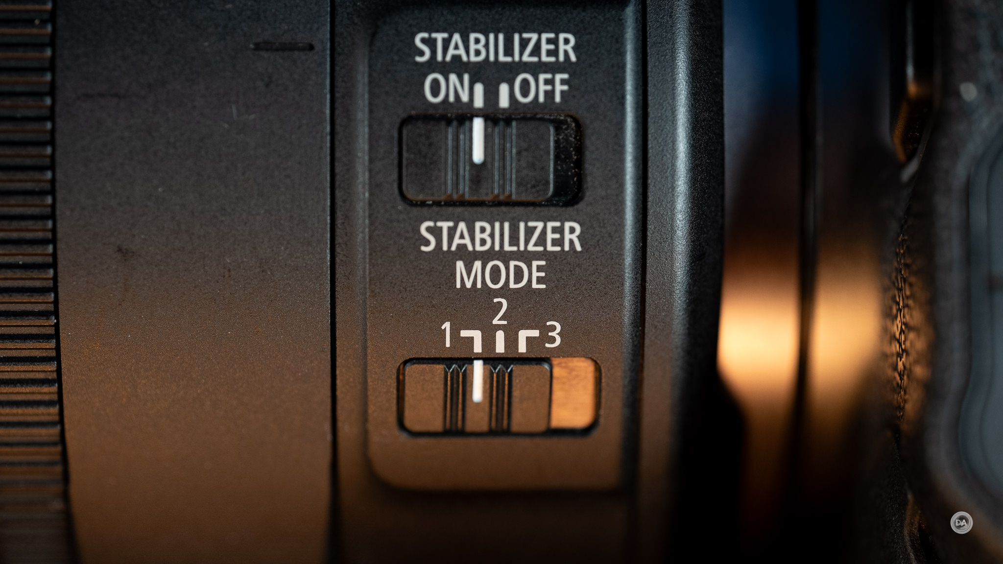 The bottom two switches are connected to the image stabilization. The top switch is just an ON | OFF for the stabilizer, while the bottom switch gives you three choices for stabilizer modes.