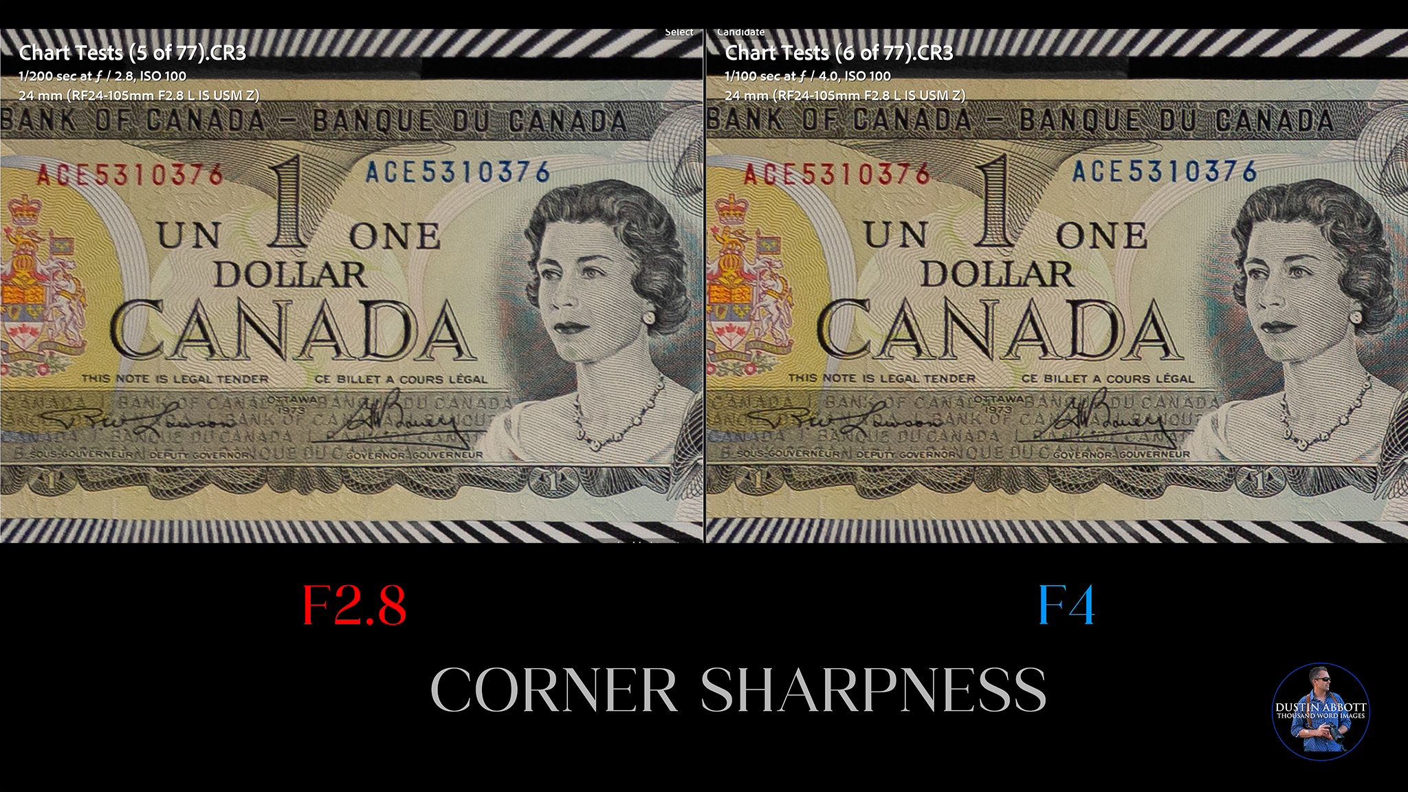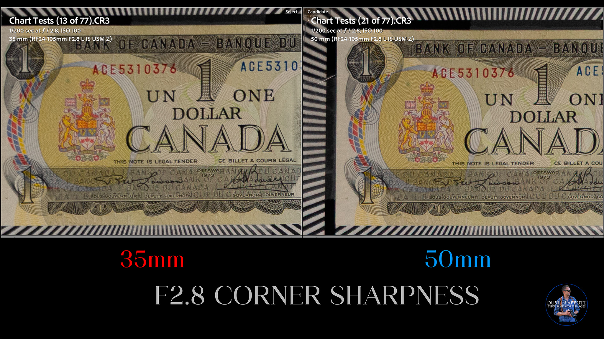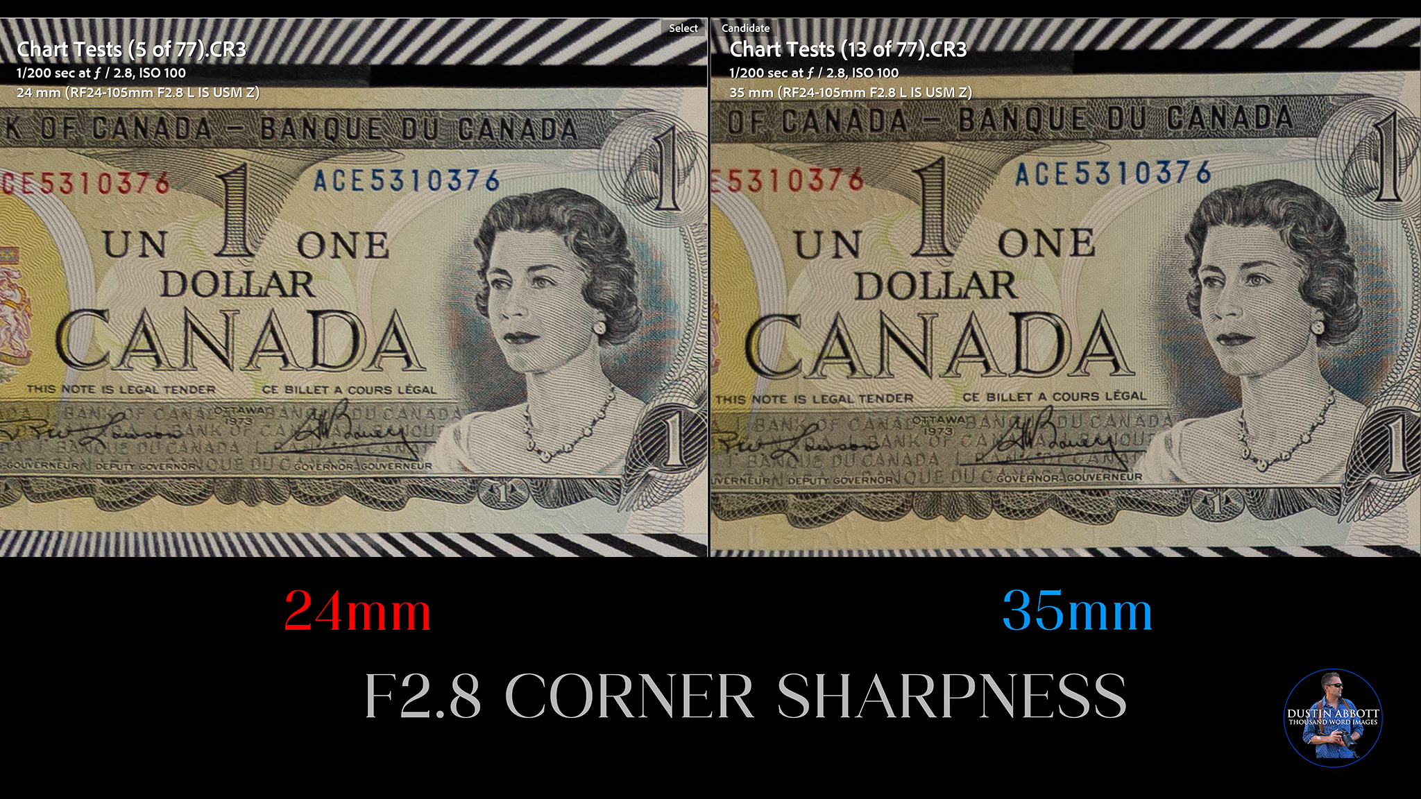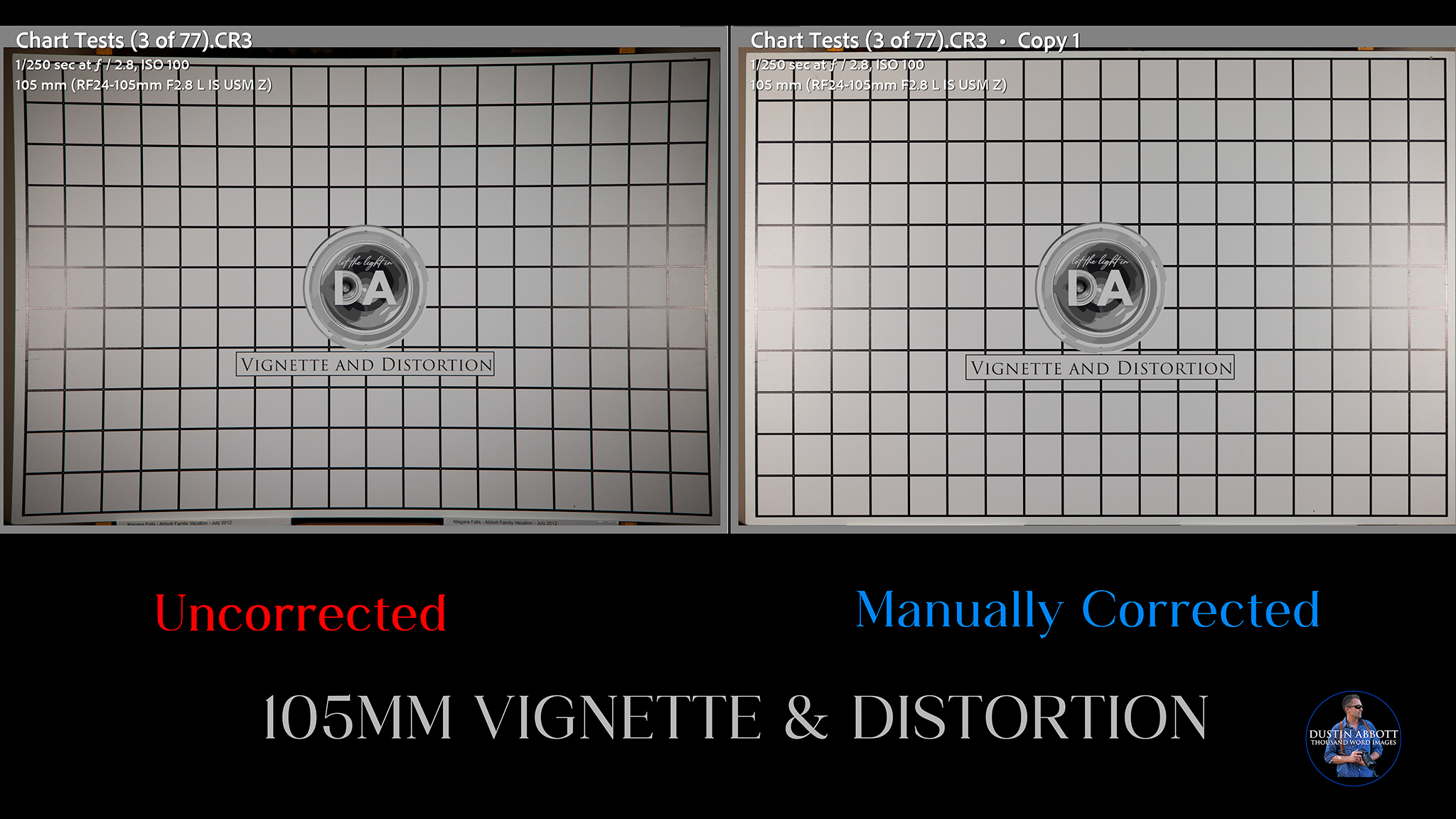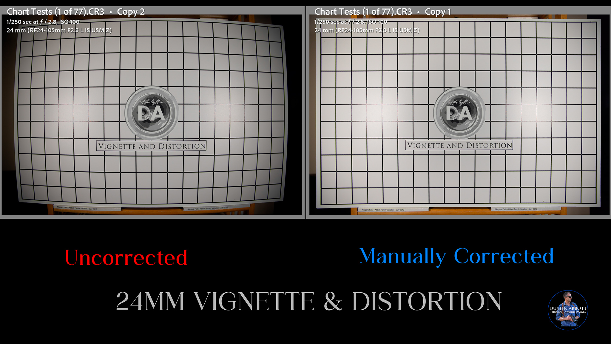 As per usual, however, we will find that Canon definitely relies on electronic trickery to achieve the end result. I know it is coming when my test chart results are tightly framed in camera and come into my editing software (Lightroom) loosely framed. That means that additional image is being captured to allow for the final image to be electronically corrected. On the plus side, Canon’s digital correction do a good job of cleaning up the mess we’re about to see. Here’s a look at the profile-corrected 24mm image.