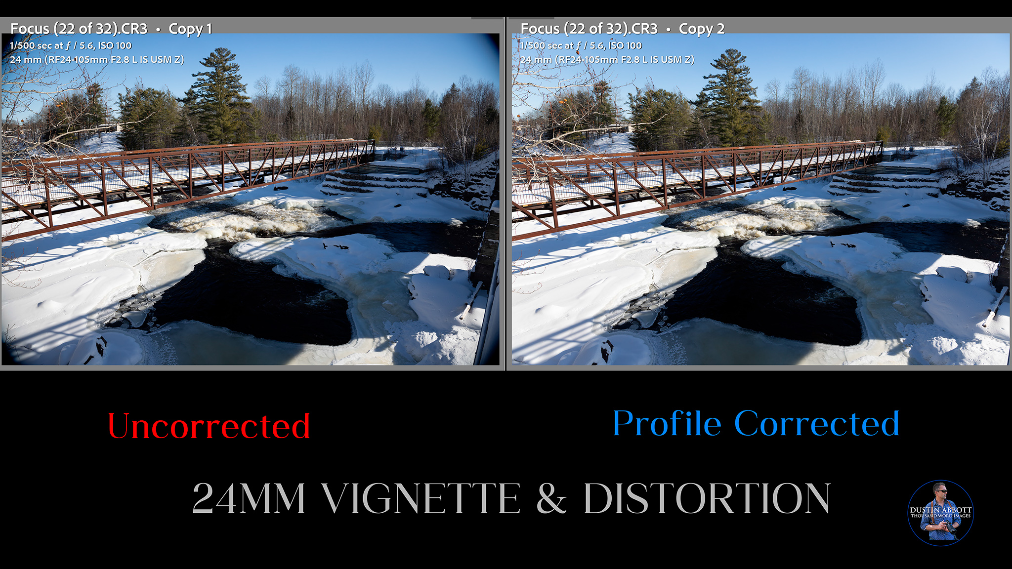 That will produce radically different results in real world shots if you have corrections off. You can see in this image that the uncorrected RAW image actually exceeds the full frame image circle (the black mechanical vignette in the corners is evidence of that), while the correction profile crops in significantly to allow the corrected image to still be 24mm.