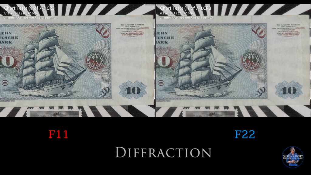 Diffraction will start to soften the image by F11 (particularly on the high-resolution bodies), with that softening becoming much more noticeable by the minimum aperture of F22.