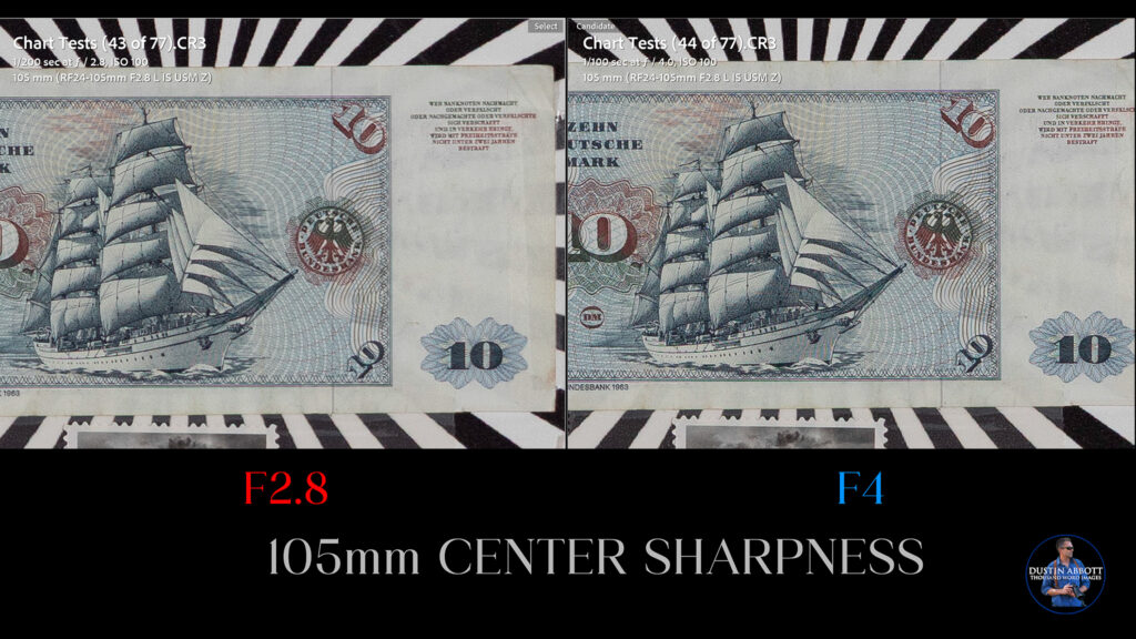 Finally, the 105mm telephoto end looks largely the same as what we’ve been seeing, though with the potential to sharp up considerable at F4: