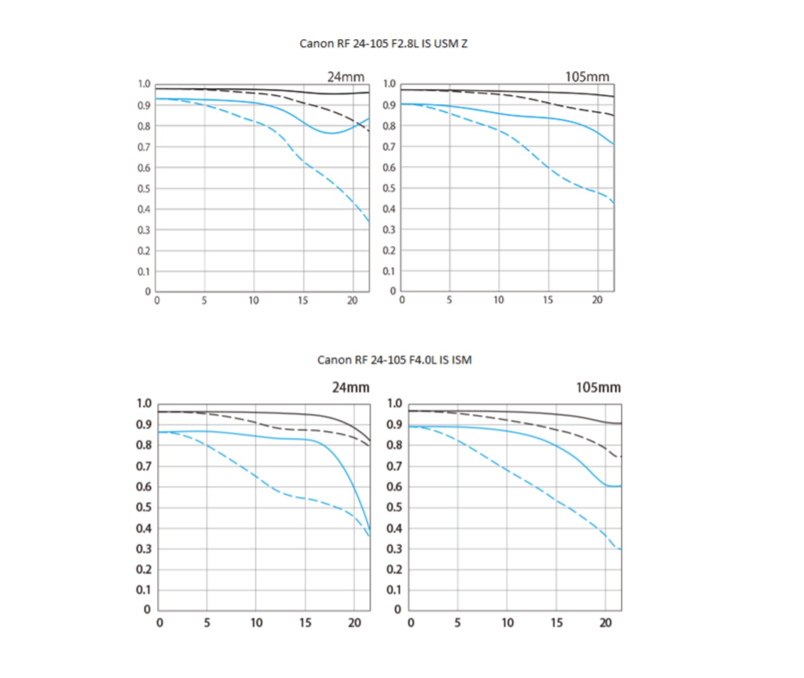 The MTF chart looks consistently good on both the wide and telephoto ends, and, as you can see, bests the RF 24-105mm F4L IS across the frame. It is better at F2.8 than the F4 lens is at F4.
