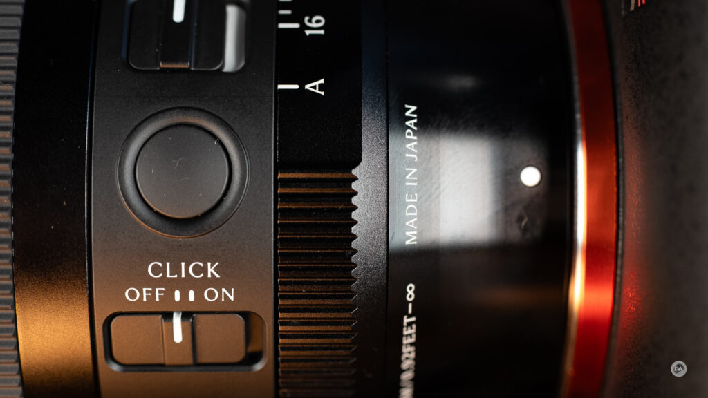 Sigma has established a high bar for their feature set on their better lenses which rivals that provided by anyone. That starts with a robust approach to aperture control. There is a manual aperture ring where you have the option to use clicks, with one third stop detents, or to declick the aperture for smooth aperture racking. The Click/Declick switch is low down on the left side of the lens. There is also an “iris lock” switch that will allow you to either lock into or out of the manual aperture ring. This ensures that you won’t accidentally end up out of the manual aperture settings or into them if you prefer to control aperture from within the camera. The iris lock switch is found on the right side of the lens barrel and has no label attached to it.
