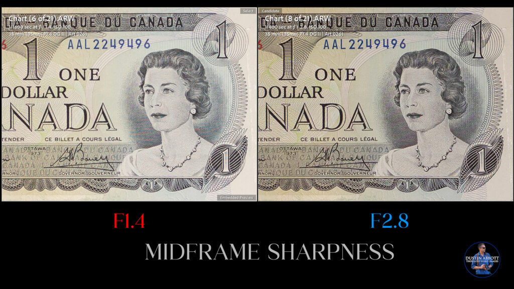 Sigma has equipped the 35mm F1.4 DC II with a competitive minimum focus distance of 28mm. That is shared with the 35mm F1.2 II, along with the magnification of right under 0.19x. That’s closer than the Viltrox 35mm F1.2 (34cm), Sirui Aurora 35mm F1.4 (35.5cm), or the LK Samyang 35mm F1.4 II (29cm) but not quite as close as the Sony GM (25cm). The Sony has the highest magnification at 0.26x, but the results from the Sigma are very useful. Here’s what that magnification looks like on my test chart: