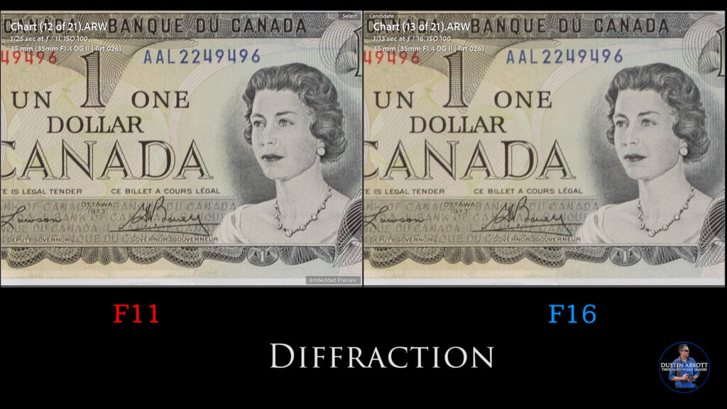 Diffraction will start to take a bite out of contrast by F11, but more noticeably by the minimum aperture of F16.