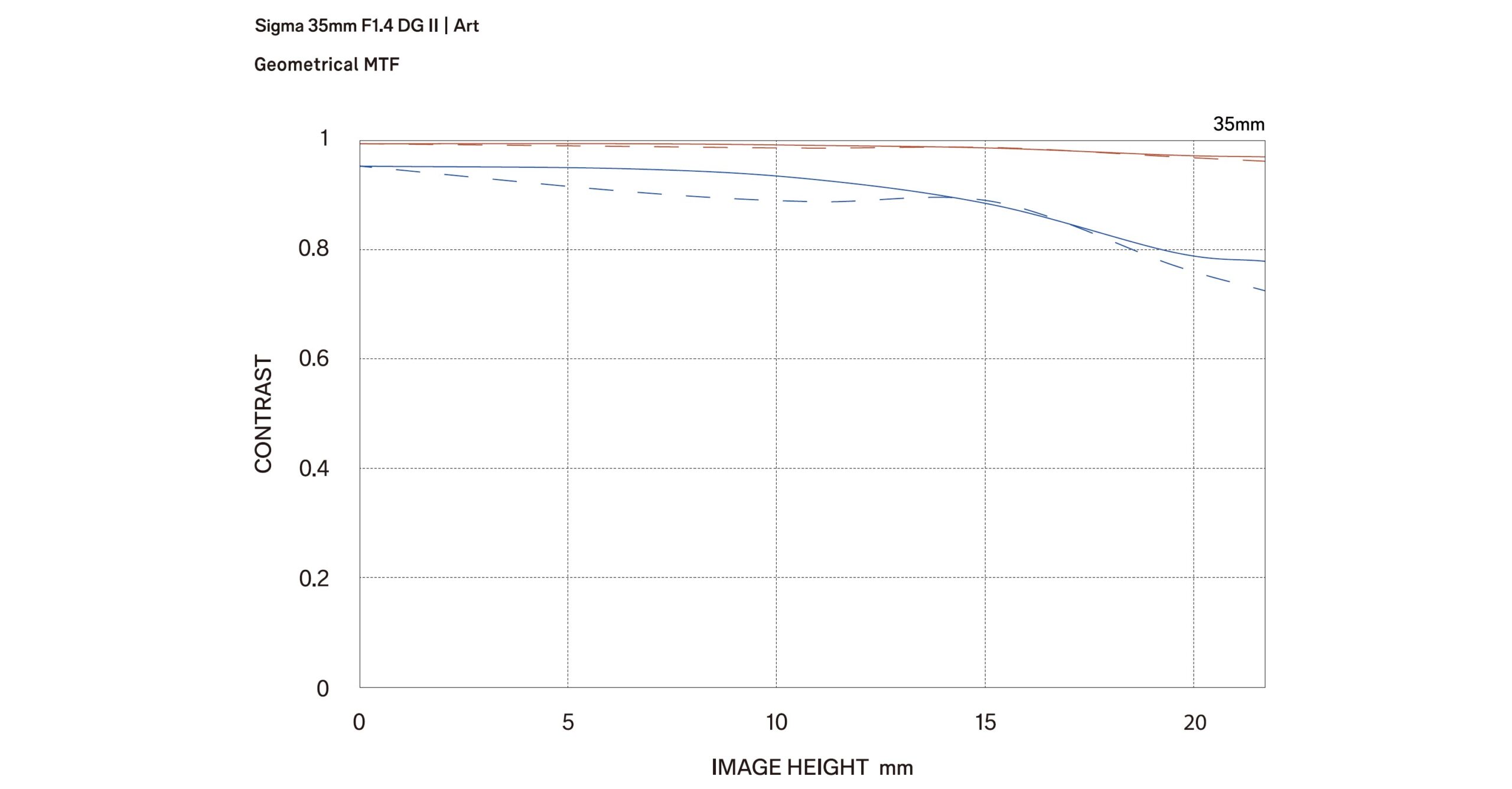 The 35mm F1.3 DG II is slightly less optically complex as the 35mm F1.2 II, but certainly isn’t a “single-digit” classic design. We’ve got 15 elements in 12 groups, including 4 aspherical elements and 2 SLD elements. The MTF shows that this is a very sharp lens, with a performance near 80% even in the corners, which is outstanding.