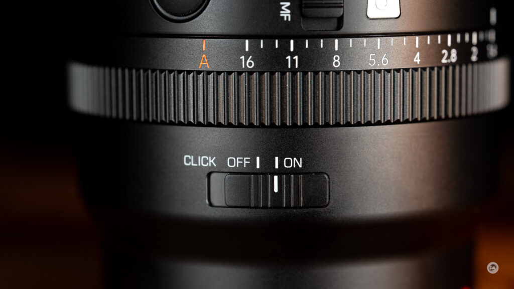The aperture ring works perfectly here, with markings at the one third stop positions and light detents at those places if you have the “clicks” on. You also have a declick option where you can smoothly rack from F1.4 to F16. There is a firmer detent between F16 and the A (automatic) option which will allow aperture to be controlled from within the camera. The one aperture feature that is missing is an iris lock which would allow you to either lock into or out of the aperture ring.