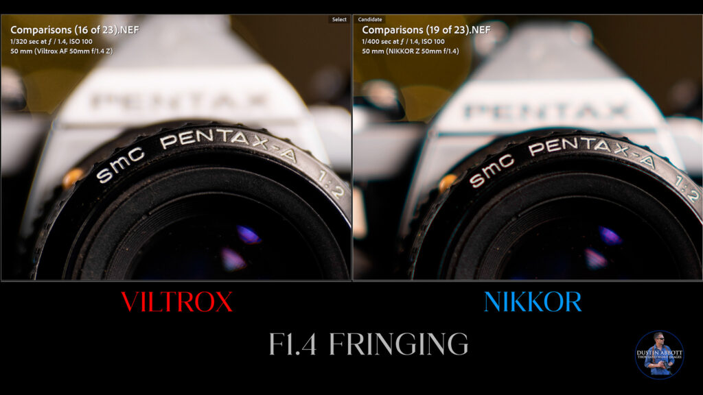 The difference in the amount of fringing is very noticeable when directly comparing to the Nikkor lens.