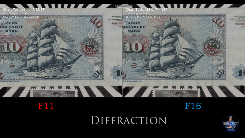 Diffraction is an unfortunate reality on higher resolution cameras, so you will see a faint softening by F11 and a more obvious softening by the minimum aperture of F16, though frankly results at 100% will still look fine. The lower resolution of my Nikon Z8 (45MP) vs the the higher of the Sony (61MP) means that diffraction is a little less obvious on Nikon.