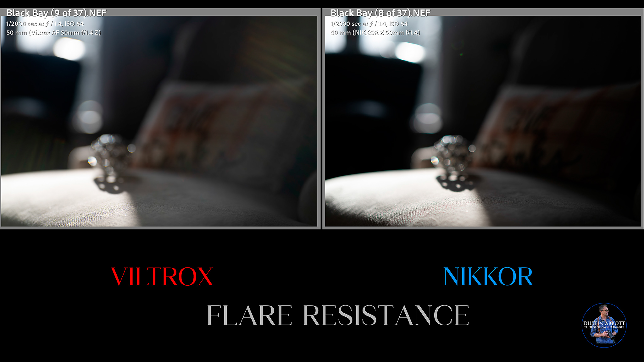 Flare resistance is also pretty decent…in most situations. This is the one test where the Nikkor took a win, as in this setup with bright window light, the Nikkor stays neutral, while the Viltrox shows some flare artifacts.