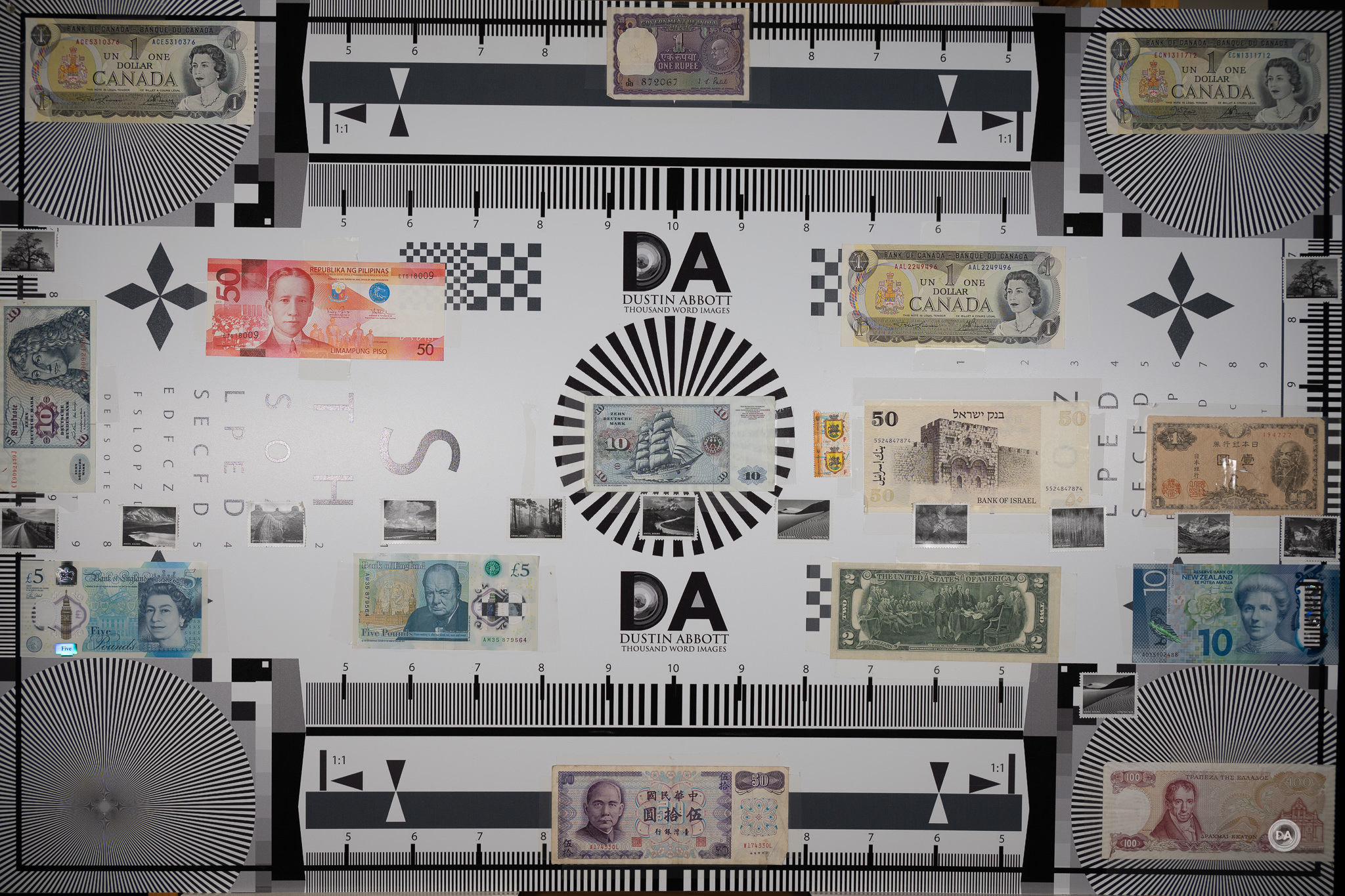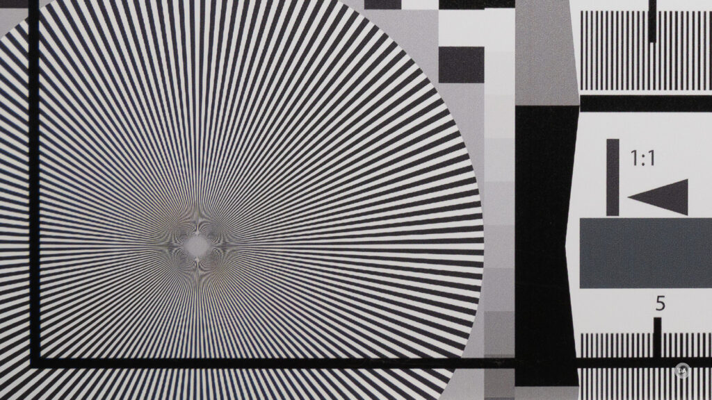 We’ll move on to inspecting our test chart. This test has been done on a 45MP Nikon Z8 sensor. I use a high end tripod and two second camera delay to ensure vibration doesn’t affect images. Here’s a look at the test chart that we will examine at high magnification: