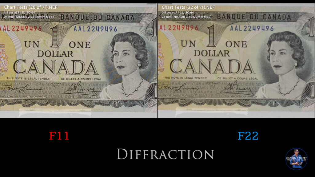 Diffraction will start to soften the image after F8, and while the impact at F11 is minimum, by F22 (which is minimum aperture), you can see a much more obviously softening.