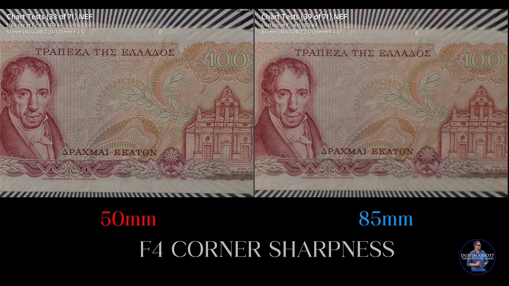The Nikkor 24-120mm F4 S is one of the rare lenses where Nikon hides what’s going on with vignette and distortion. You don’t have the option of disabling distortion control in camera, and even the .NEF (RAW files) arrive in Lightroom with the corrections baked in. Here’s what they look like at 24mm, 50mm, and 120mm.